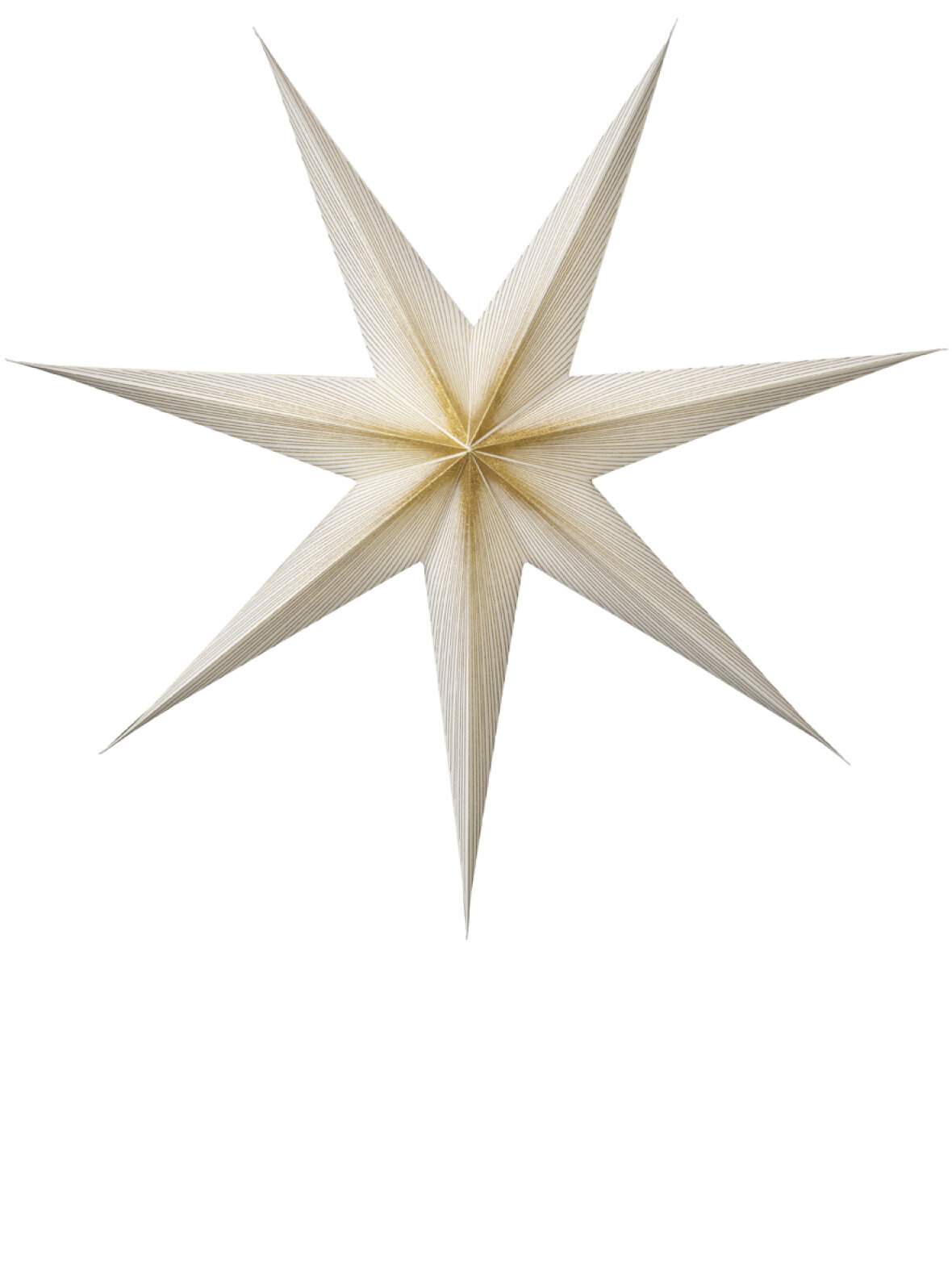 Smuk håndlavet papirs stjernelampe fra Bungalow i hvid og pyntet med guldglimmer.