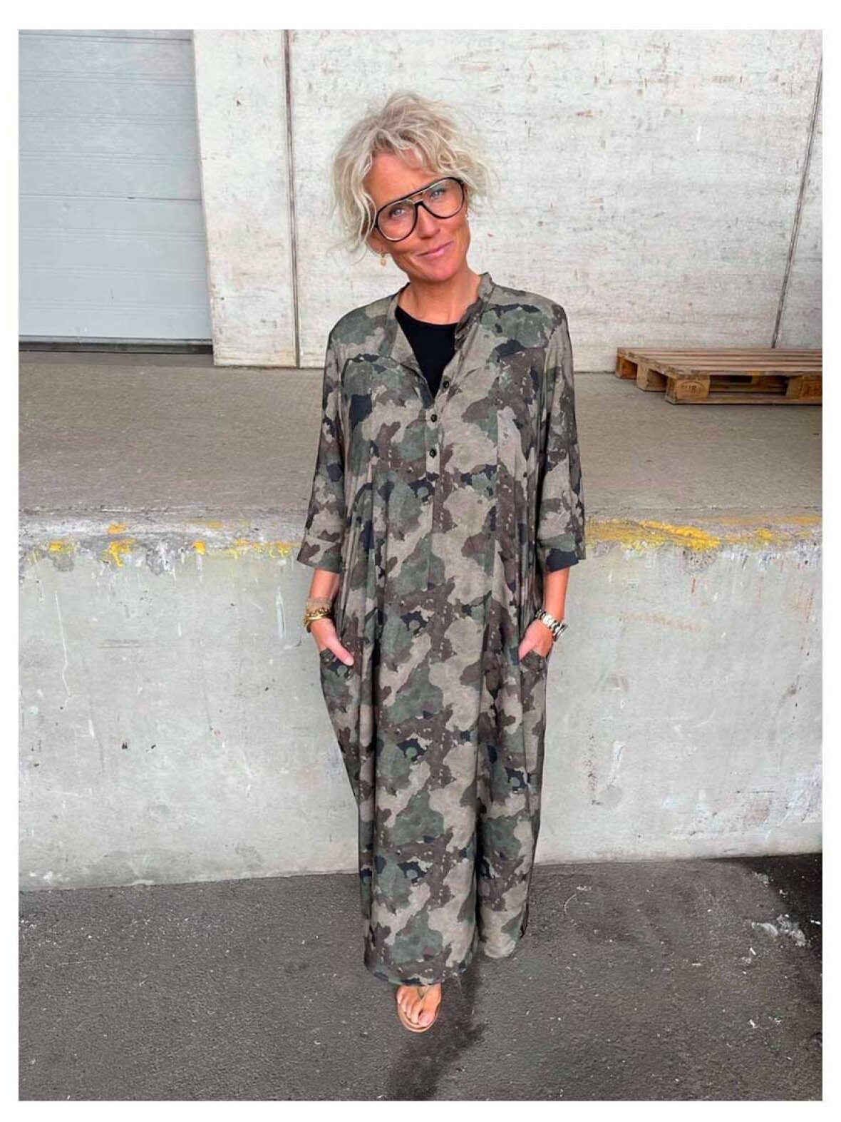 ❤︎ Skøn camouflage kjole fra Black Colour i en lækker let kvalitet. Kjolen har 3/4 lange ærmer og knapper ned over brystet.