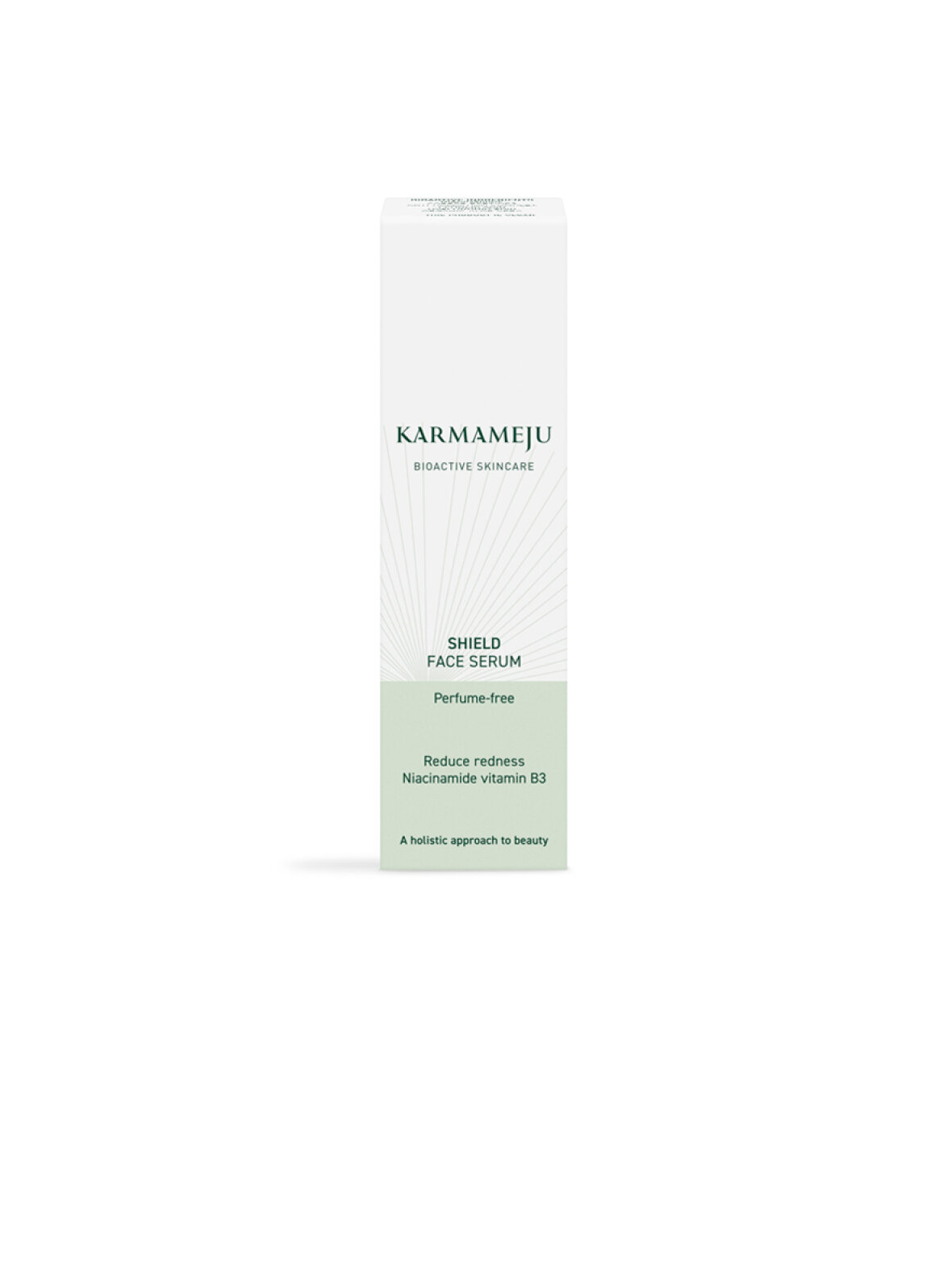 SHIELD Face Serum fra Karmameju virker som et beskyttelsesskjold mod celleskader og forurening. Ved daglig påførelse repareres og styrkes hudbarrieren, dybdehydrering samt reducering af rødme.