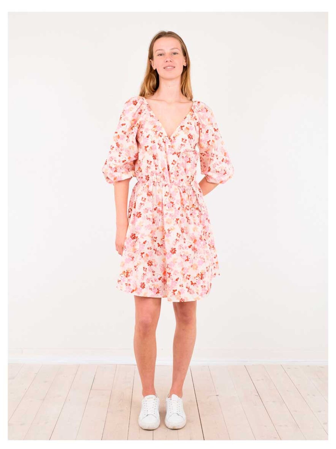 ❤︎ Smuk slå om kjole fra Neo Noir med fine detaljer. Kiki Sunny Floral kjolen er designet som en kortere kjole med elastik i taljen og slå om effekt med bindebånd i siden. Kjolen er med løs pasform og fine puf ærmer med elastik kant.