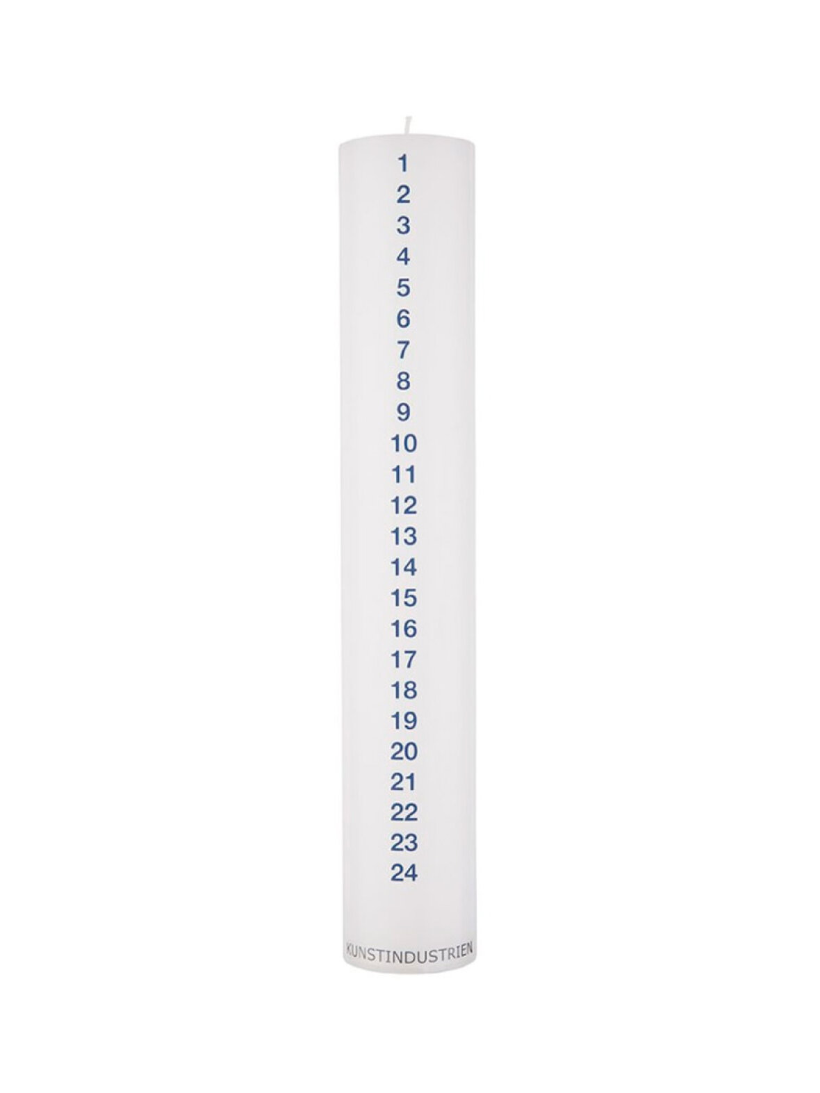 Smukt og enkelt adventslys fra Kunst Industrien i hvid med blå tal. Smukt lys til at dekorere årets juledekoration eller kalenderstage med.