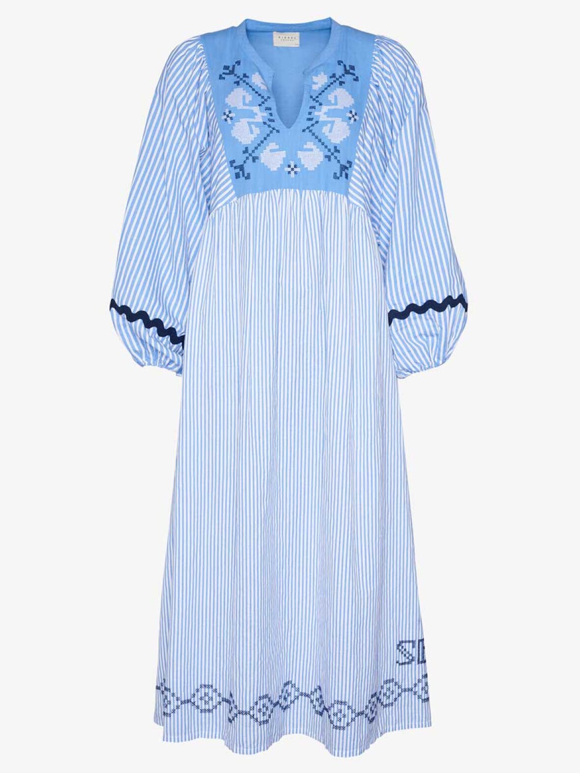 ❤︎ Smukkeste kjole fra Sissel Edelbo med et flot broderi inspireret af traditionel korssting. Beate kjolen er designet som en lang kjole med løstsiddende pasform, sidelommer og har store voluminøse ballon ærmer med elastik ved håndleddet. En virkelig skøn og smuk kjole med en behagelig løs pasform.