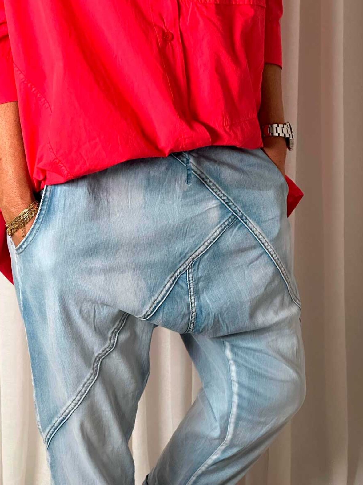 ❤︎ Cool Cabana Living jeans i en lækker blød og let denim kvalitet. Nicolina jeans er designet med løst baggy fit og har elastik og snøre i taljen for perfekt tilpasning. Asymmetriske sømme, samt bag- og sidelommer tilføjer et lækkert finish til den super komfortable og behagelig jeans.