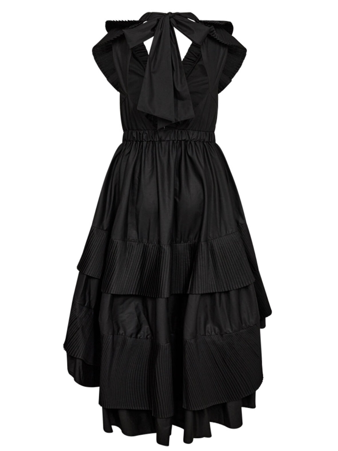 ❤︎ Smukkeste kjole fra Copenhagen Muse med fine flæse detaljer. Pleat kjolen er designet som en længere kjole bagtil og kort fortil. Fine plissé flæser pryder kjolen, som har elastik i taljen, åben på ryggen, samt bindes med en sløjfe i nakken. En virkelig smuk kjole i en let poplin kvalitet og med masser af vidde i skørtet.