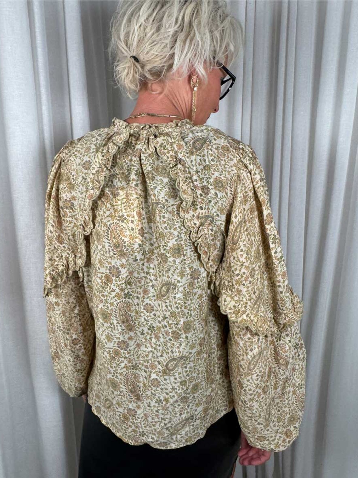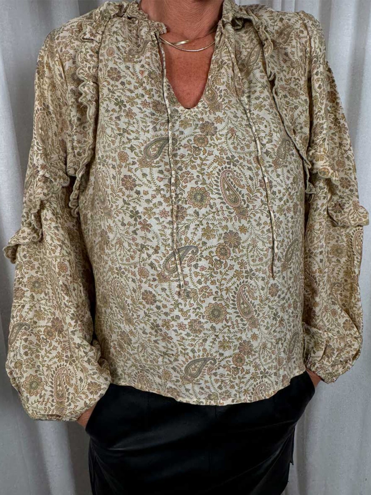 ❤︎ Balla Silk blusen fra Sissel Edelbo er designet af de smukkeste upcyclet vintage sarier og re-designet med et moderne snit, rummelig pasform og fine detaljer. Balla blusen er designet med lange løse ærmer med elastik ved håndleddet og har fine flæser på fronten, som sammen med det lette og levende silke, giver Balla blusen en flot elegance.