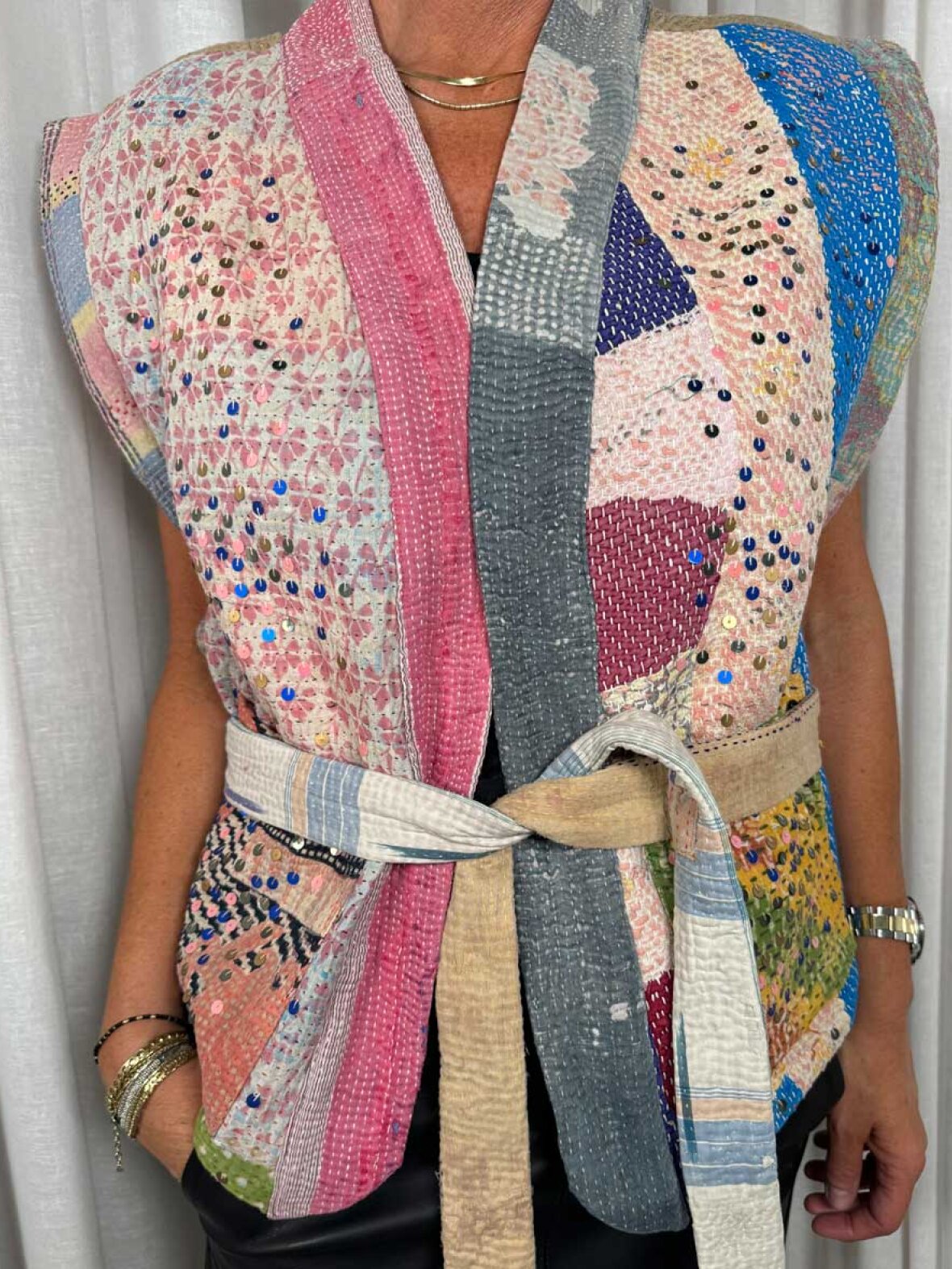 ❤︎ Smuk vest designet af håndlavede vintage kantha tæpper med fine pailetter. Emery Sequins Vesten fra Sissel Edelbo er en smuk vest, designet med et aftageligt bælte for at fremhæve din feminine silhuet. Vesten har brede vingeskuldre og er håndlavet af indiske håndværkere. Den smukke vest er lavet med Kantha-broderieteknikken, der smukt genbruger gamle bomuldssarier, som tidligere er blevet båret af indiske kvinder, og giver dem nyt liv som recycled tøj og tæpper. Stoffet ligges oven på hinanden og håndsyes ved hjælp af den traditionelle Kantha-broderiteknik, som er kendetegnet ved de mange rækker med korte, sammenhængende sting. Emery vesten er derfor helt unik, da den er lavet af genbrugte, håndlavede, vintage Kantha tæpper, hvilket gør, at der kun findes én med helt samme farvekombination.