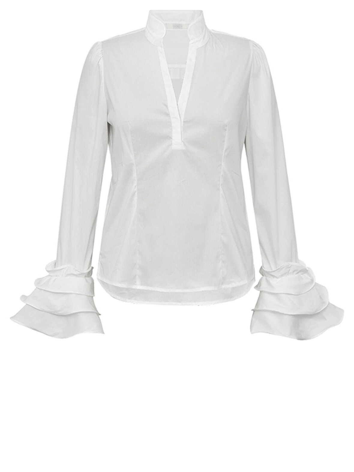 ❤︎ Feminin GOSSIA skjorte med elegante flæse manchetter. Asta skjorten er designet med en elegant figursyet pasform, som fremhæver kroppens former. Skjorten er med lange ærmer med voluminøse flæser ved manchetten, samt har en lille slids i hver side forneden.