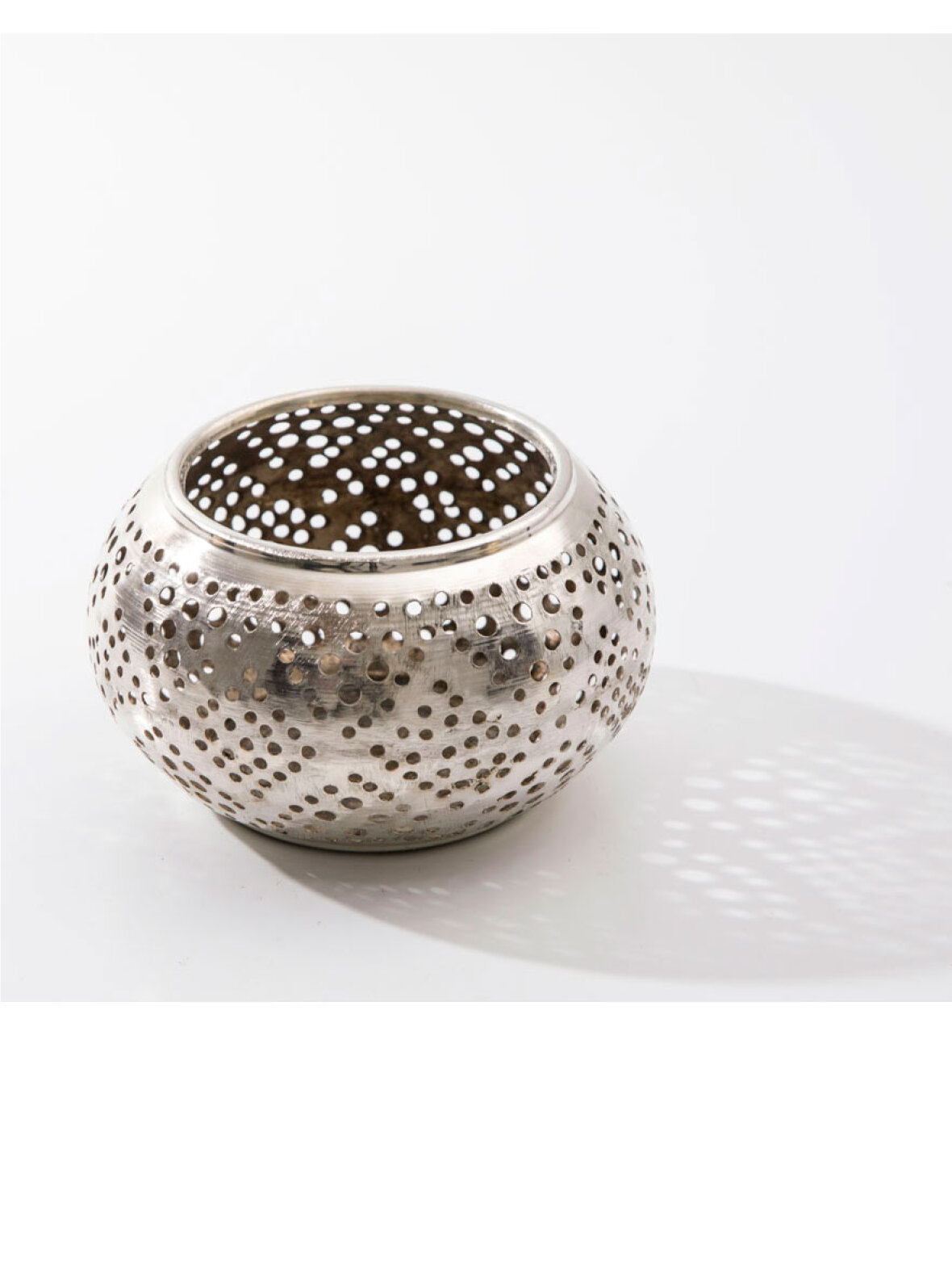 Håndlavet fyrfadsstage i sølvbelagt messing skabt af to brødre i Marrakesh. Denne smukke stage har fine udskæringer, der kaster et eventyrligt lys. Perfekt til at skabe hygge på mørke aftener – alene eller mixet med flere. En skøn gaveidé!