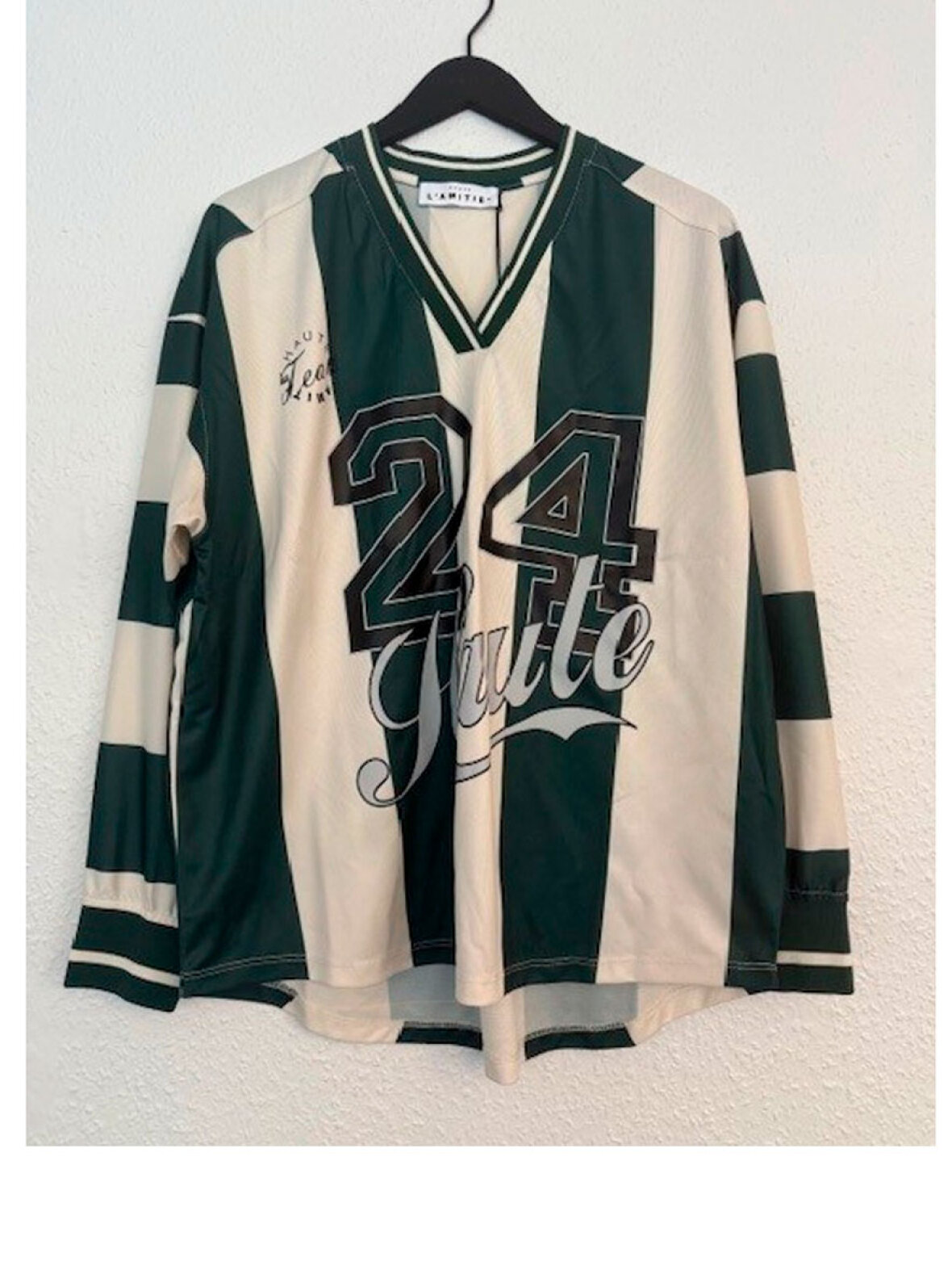 ❤︎ Super cool sporty bluse fra Haute L'amitié med brede striber. Haute 24 Stripe blusen har en v-udskæring, ribkanter og sportsinspirerede tryk. Blusen er i tyndt materiale og har en cool oversize pasform.