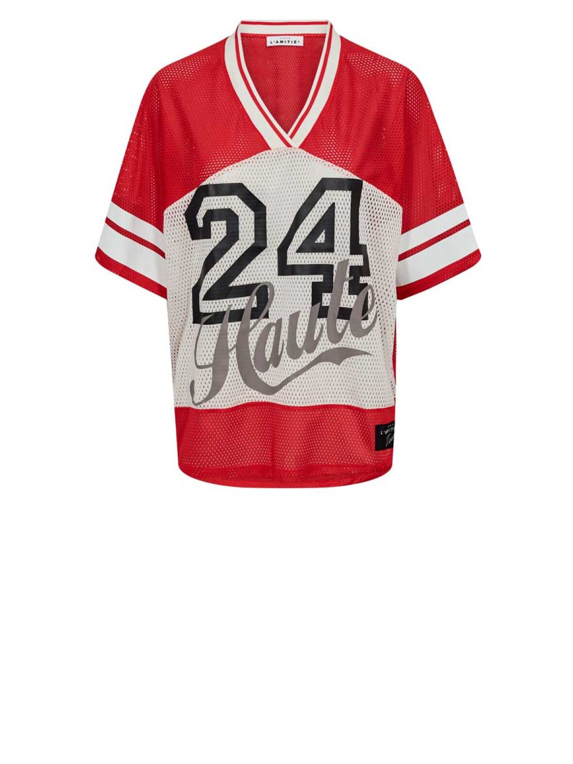 ❤︎ Cool sports inpireret t-shirt fra Haute L'amitié med korte brede ærmer. Drift Combo Number t-shirten er designet i transparant net kvalitet med oversize pasform, har v-udskæring og seje sports tryk foran.