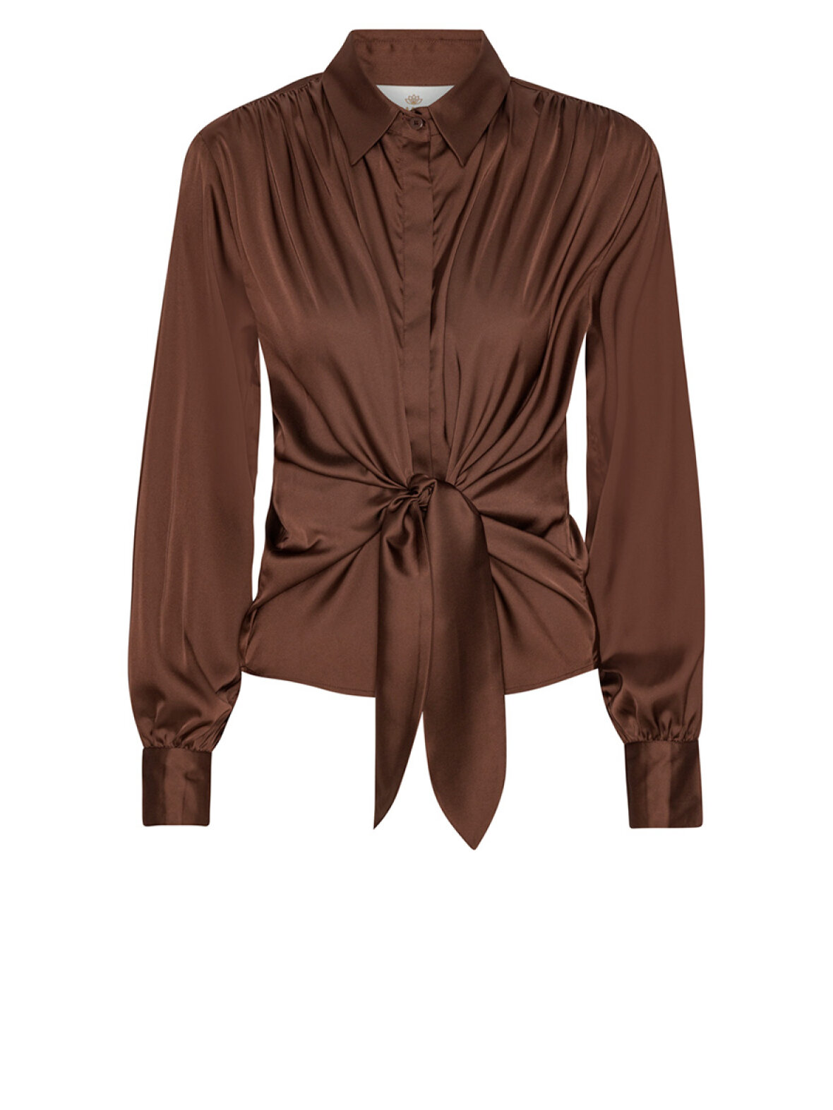 ❤︎ Smuk skjorte bluse fra Karmamia i en lækker blød og let kvalitet i et flot stribet satin look. Skjorten har lange løse ærmer, krave og skjult knaplukning ned foran. En virkelig smuk skjorte bluse med et flot bånd foran, som giver en smuk detalje og fremhæver din figur.