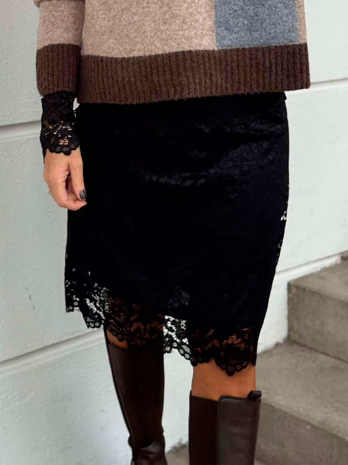❤︎ Smuk kortere blondenederdel fra Marta. MdcGeyser nederdelen har elastik i taljen og en tætsiddende pasform med let stræk i. Indvendigt er et fast syet underskørt.