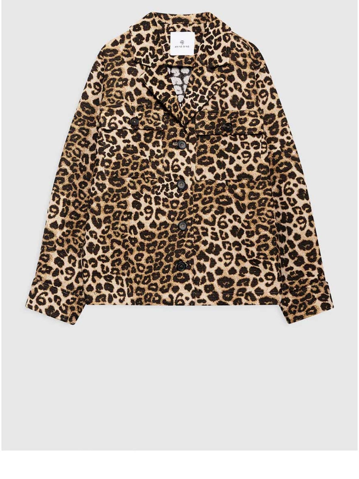❤︎ Cool leopard jakke fra Anine Bing med revers og brystlommer samt sidelommer. Flynn jakken er designet i et trendy oversize box fit med lange ærmer og knapper ned foran. En skøn jakke i en lækker blød og kraftig kvalitet.