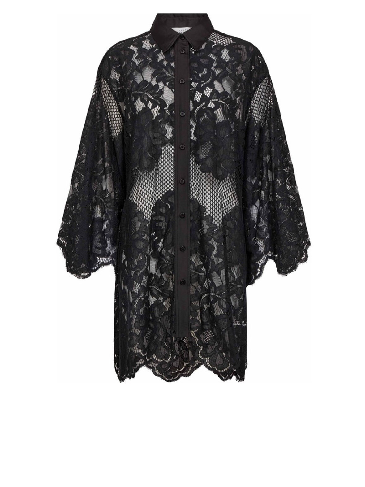 ❤︎ Super cool transparant blondeskjorte fra Haute L'amitié. Curvey Lace Hem Midi skjorten er designet som en lang skjorte, med brede 3/4 ærmer og en cool klassisk krave. Skjorten har en knaplukning foran og har et meget oversize fit.