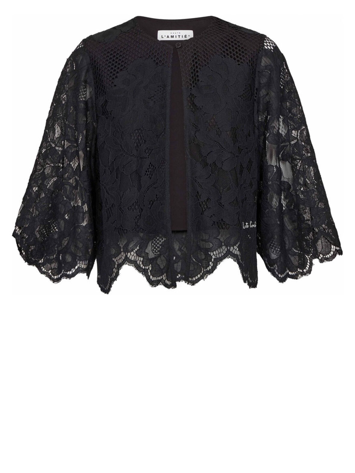 ❤︎ Smuk bolero med fine blonder og inderfoer. Curvey Lace Hem boleroen har brede 3/4 ærmer lukkes med en enkelt lille knap øverst og står ellers åben.