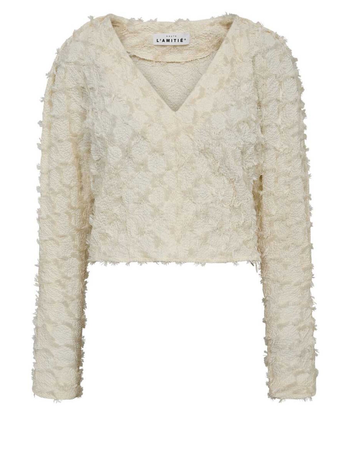 ❤︎ Smuk bluse fra Haute L'amitié med v-udskæring og lange ærmer. Stuff Structure V-blusen er designet med all-over frynser, som giver smukke strukturdetaljer. Blusen har en tætsiddende pasform i lækker strækbar kvalitet. Den lukkes i siden med en skjult lynlås.