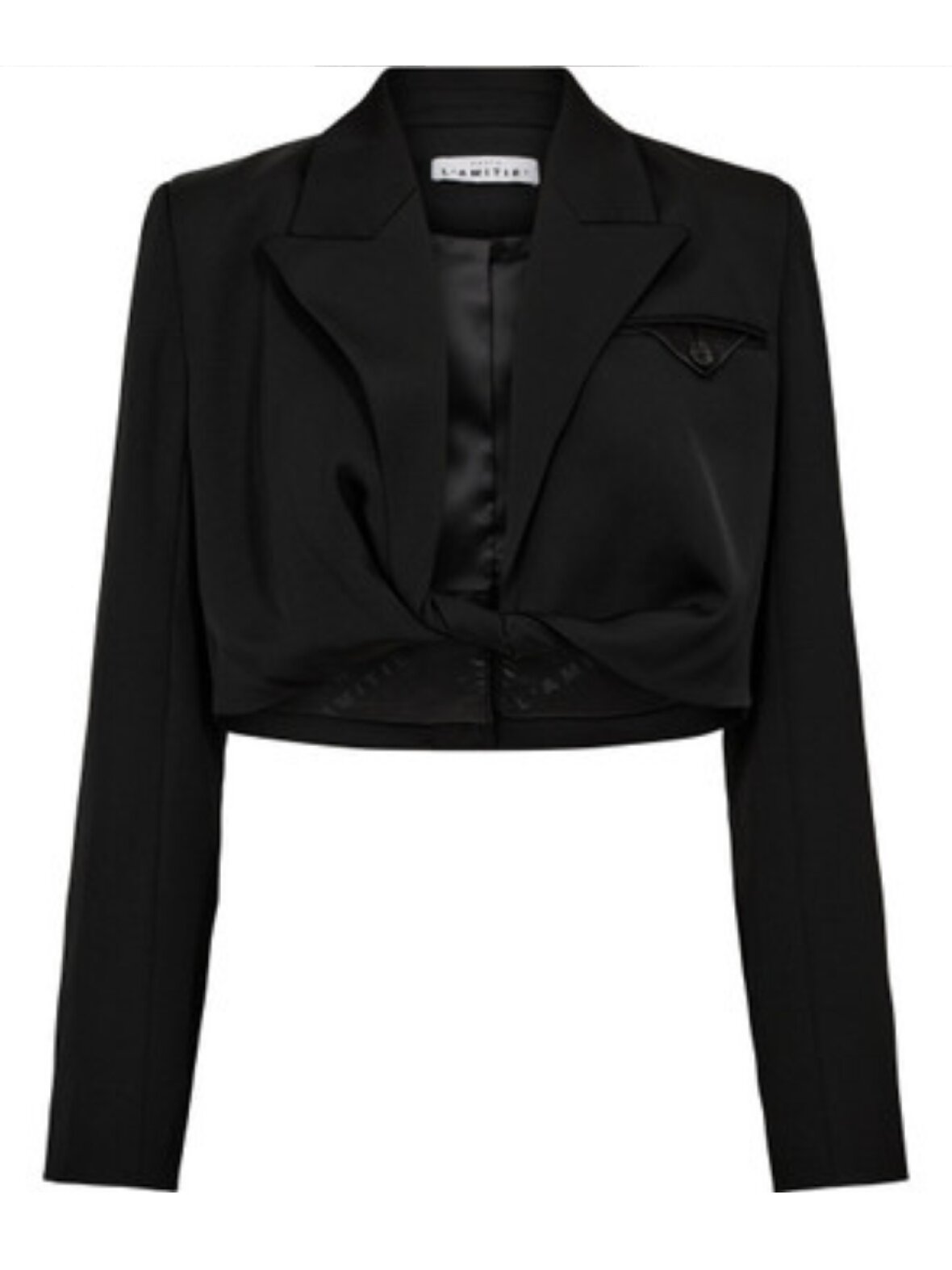 ❤︎ Smuk habit blazer fra Haute L'amitié med cropped pasform. Jazzy Twisted Crop blazeren er designet med et revers og fin twisted detalje i taljen. Den har lange ærmer, skulderpuder og fin satin detalje på brystet. I siden lukkes den med skjult lynlås.
