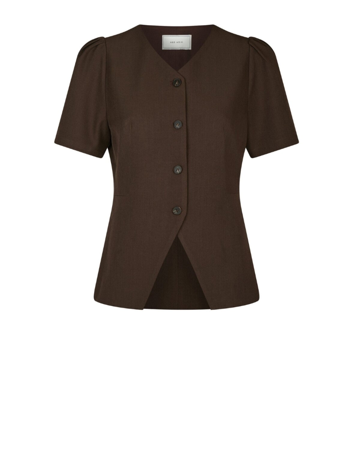 ❤︎ Smuk bluse fra Neo Noir i lækker "habit lignede" kvalitet. Jules Structure blusen er designet i en flot brun nuance, med korte pufærmer og i snit i taljen som giver flot figur. Blusen har en v-udskæring og lukkes med knapper foran.