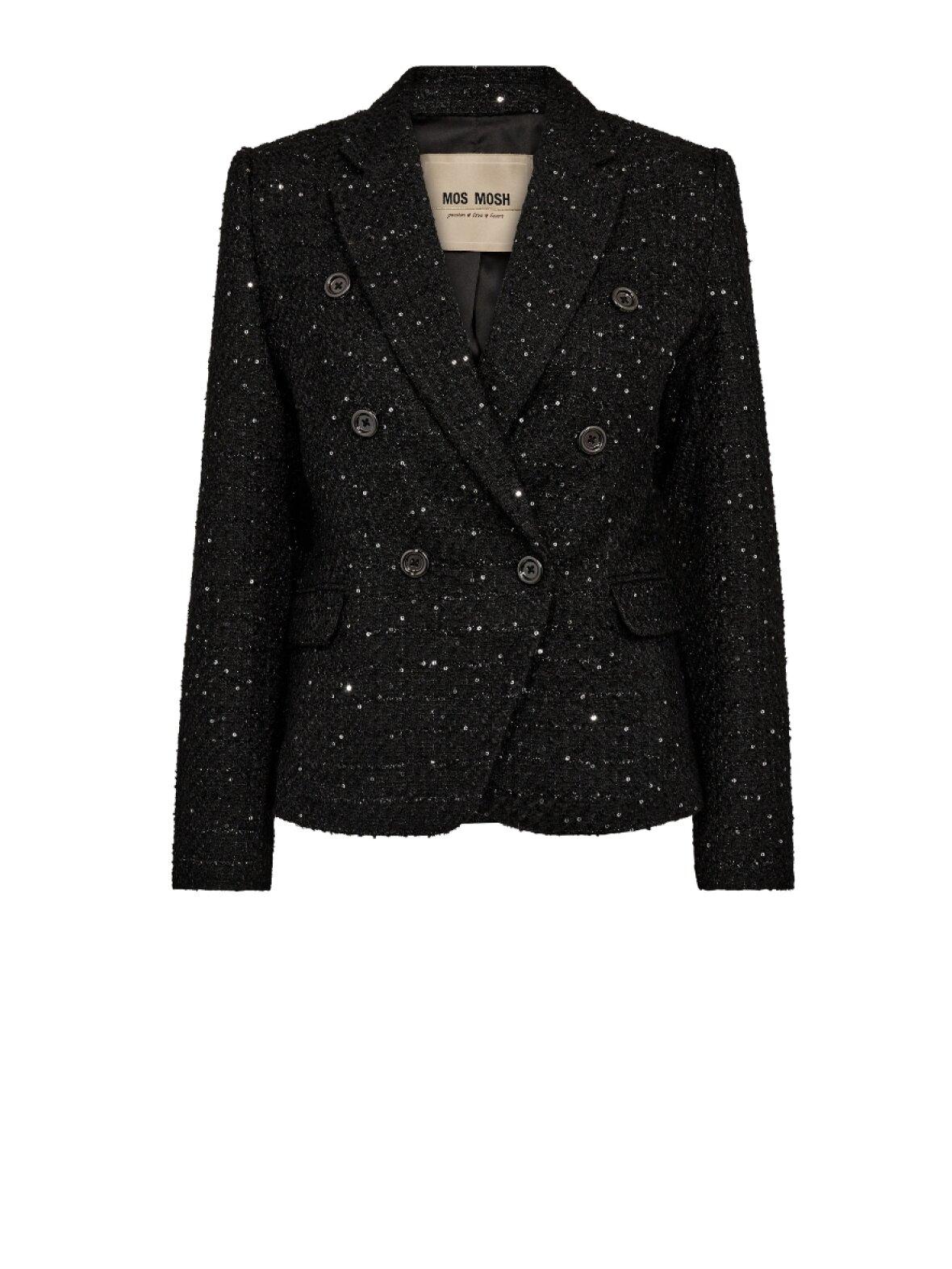 ❤︎ Smuk blazer fra Mos Mosh dekoreret med flot struktur samt pailletter i materialet. MMBelize Bouce blazeren har revers, en regulær pasform og lommer med klap foran. Den lukkes med dobbeltradet knaplukning og har et satin foer indvendigt.