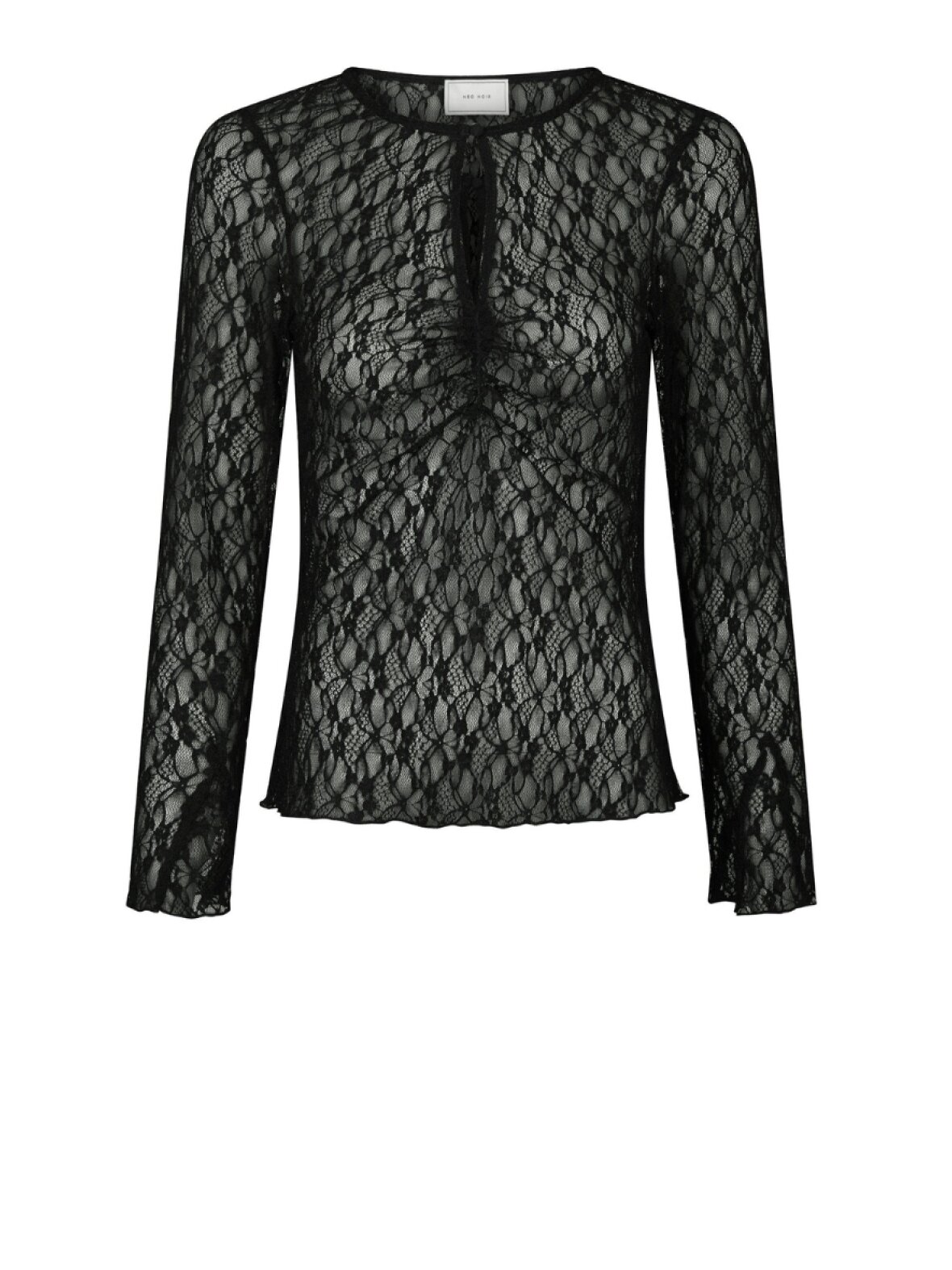 ❤︎ Smuk transparant blonde bluse fra Neo Noir med lange elegante ærmer. Matria Lace blusen har en flatterende tætsiddende pasform i strækbart materiale. Den er designet med rynk og slids ved brystet, som kan lukkes med en enkelt knap i den runde hals.