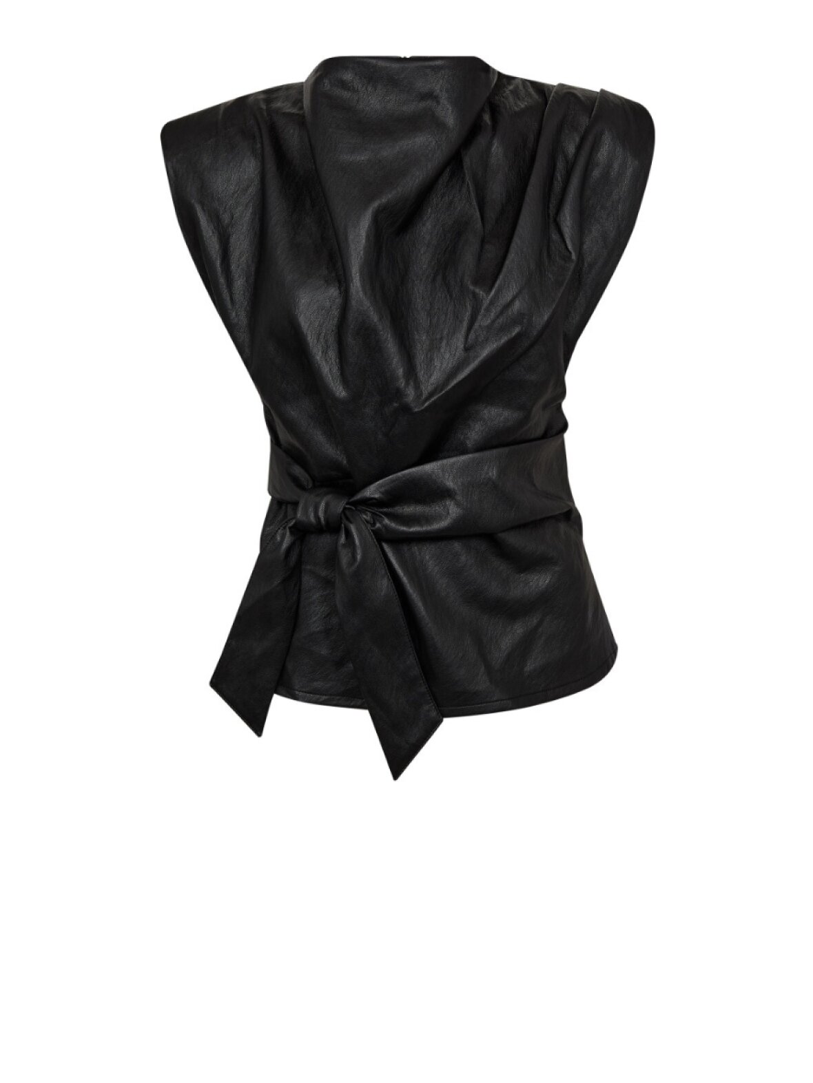 ❤︎ Skøn top i imiteret skind fra Co'Couture uden ærmer. GittCC Pleat toppen er designet med skulderpuder, fine læg på skulderen og bredt bindebånd i taljen, som danner smuk figur. Den fine top har en smuk vandfaldshals og lukkes med skjult lynlås i ryggen.