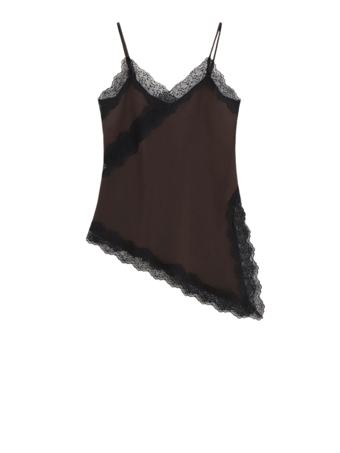 ❤︎ Smuk satintop fra Imperial med tynde justerbare stopper. Toppen er i den fineste brune farve, med smukke blondekanter i sort. Nederst har den en skrå kant og et slids i den ene side. Toppen kan både styles til fint brug, men også gøres mere rå med jeans eller andet under.