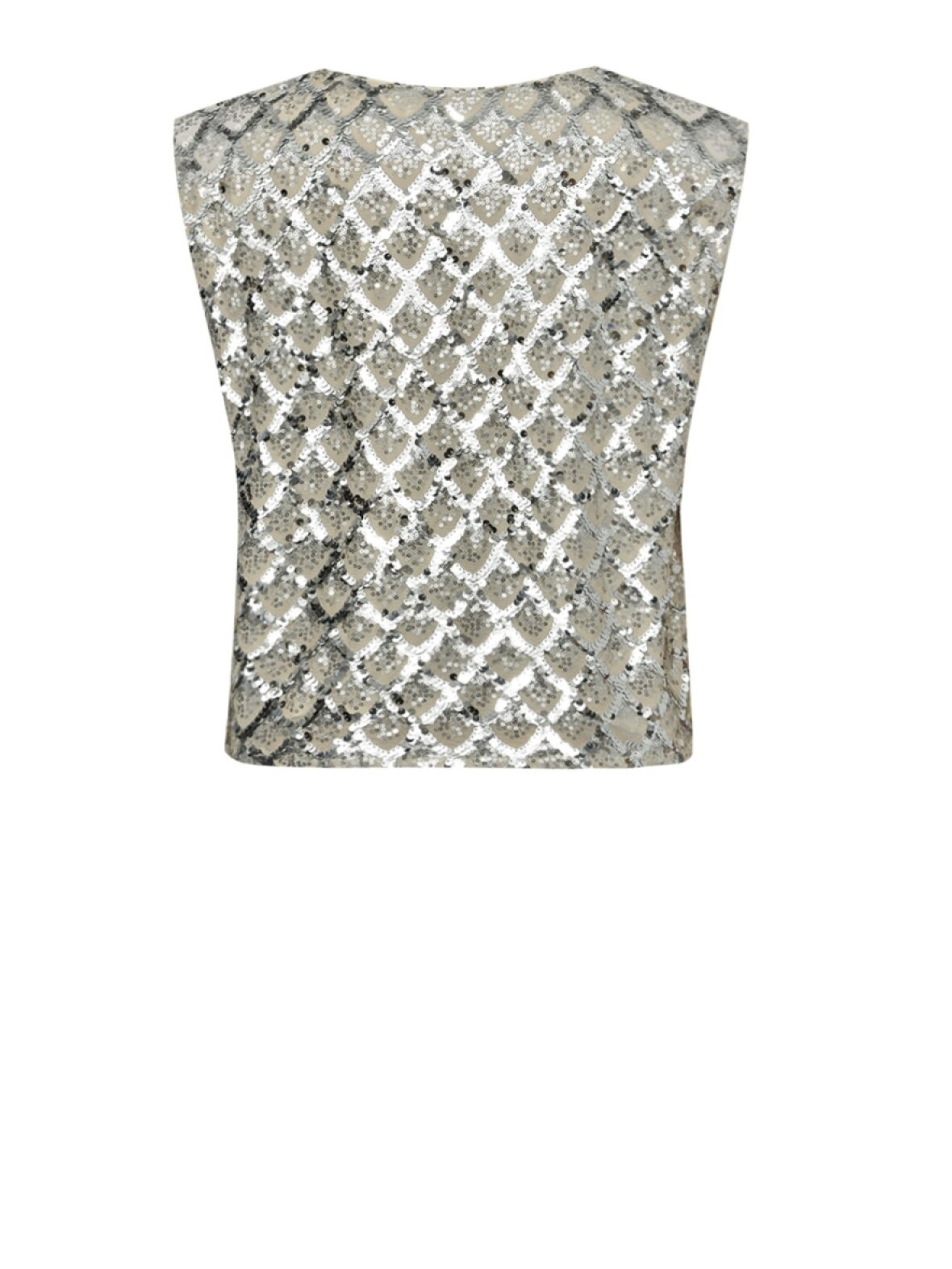 ❤︎ Festlig paillettop fra Gossia uden ærmer. HollyGO toppen er designet med en rund hals, uden ærmer og med skulderpuder. Toppen har en løs, let bred pasform og en fastsyet undertop.