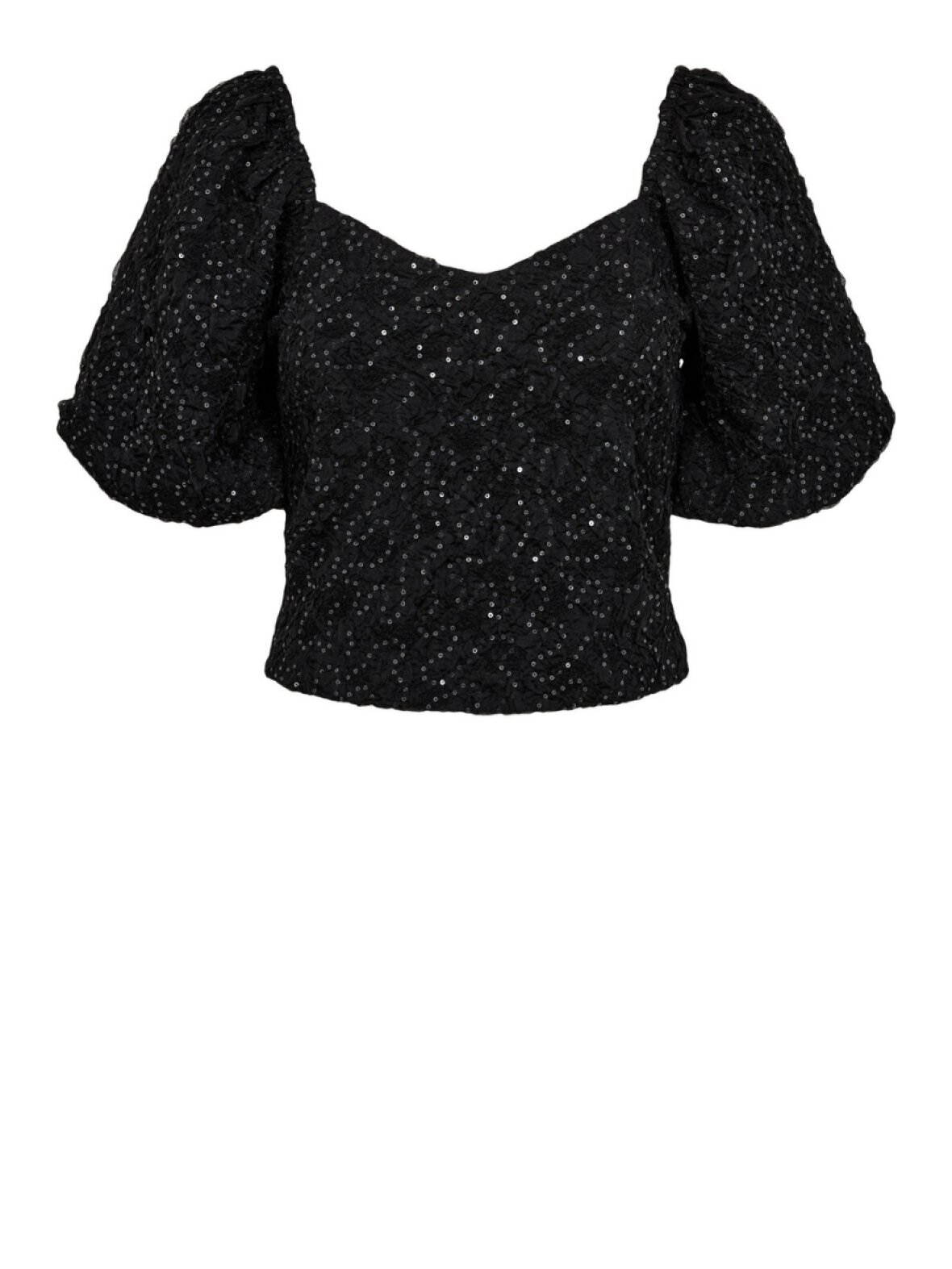 ❤︎ Smuk paillettop fra Hatue L'amitie. Toppen er kort i pasformen, har store smukke pufærmer og dybe halsudskæringer både foran og bagpå. Den lukkes bagpå med lynlås. Toppen er lavet i det blødeste og strækbare materiale.