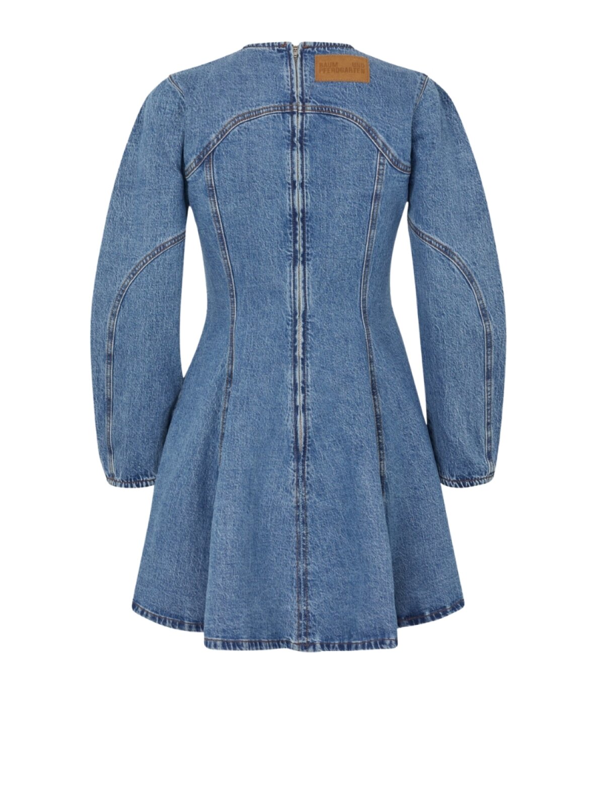 ❤︎ Smuk denimkjole fra Baum Und Pferdgarten med lange ærmer. Aney kjolen har seje kontrastsyninger, en rund hals og lukkes med lynlås i ryggen. Kjolen sidder let til øverst og har en smuk a-shape i skørtet.