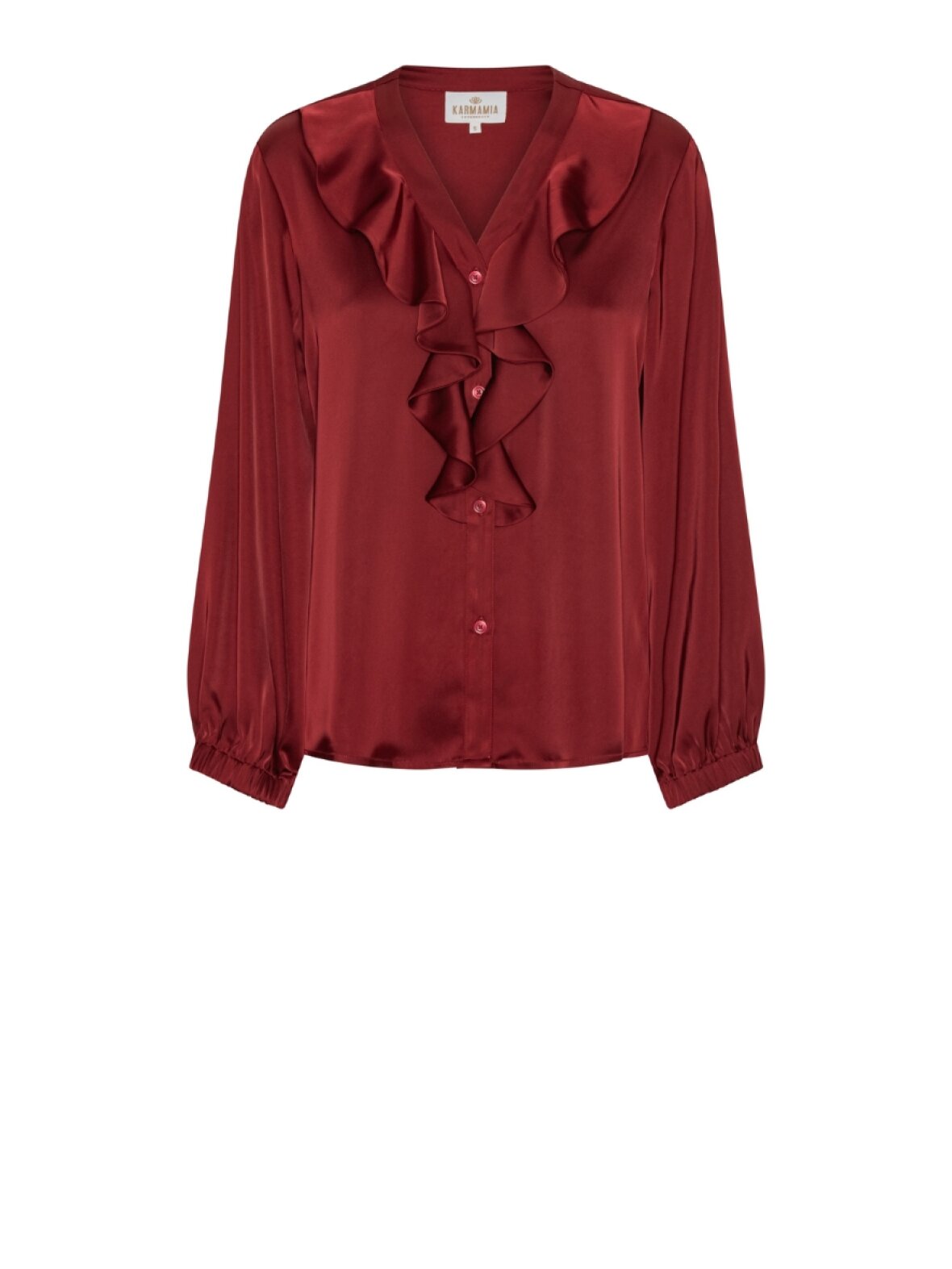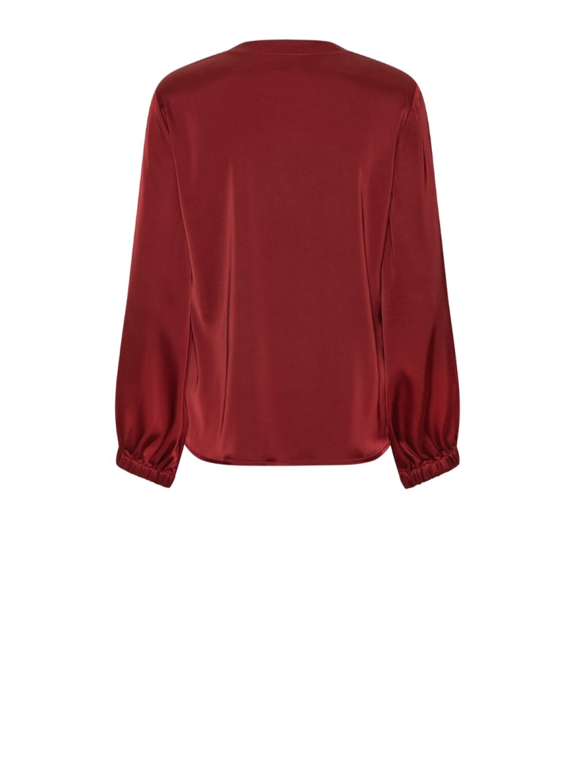 ❤︎ Smuk feminin bluse med V-hals og flæsedetalje. Blusen har lange ærmer med elastisk kant. Den lukkes med knaplukning ned foran og er lavet i den blødeste satin kvalitet.