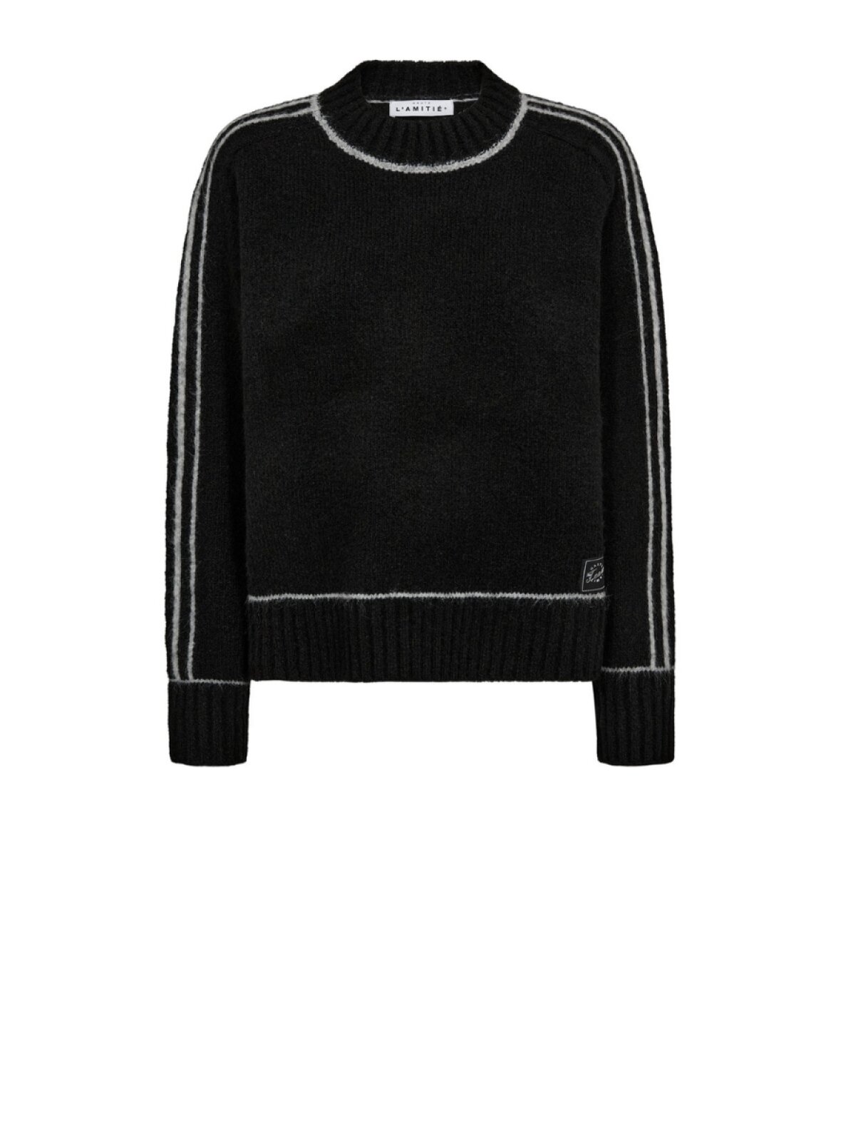 ❤︎ Skøn strik i blødt materiale fra Haute L'amitié med en rummelig pasform. Toby Line O-Neck strikken har en høj hals, fine kontrastfarvede linjer og lange ærmer med brede ribkanter.
