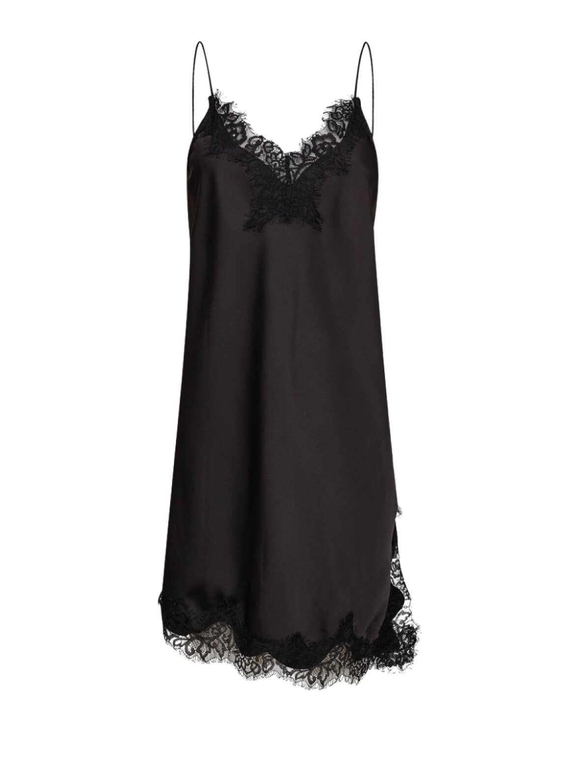 ❤︎ Skøn satin kjole fra Haute L'amitié med flotte blondekanter. Naomi Asym Lingerie kjolen har tynde justerbare stropper, en fin v-udskæring og en skrå kant nederst med slids i den ene side.
