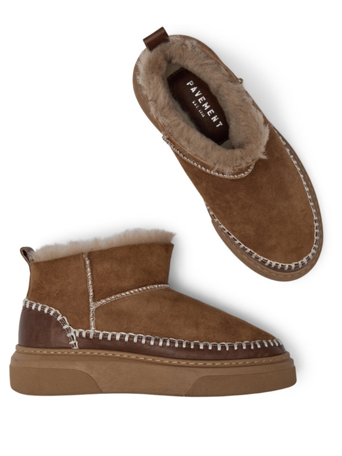 Skønne varme ankelstøvler fra Pavement i flot ruskind. Suvi støvlen har en chunky gummisål og et lækkert varmt uldfor indvendigt. De har en rund snude og er designet med fine hvide stikninger.