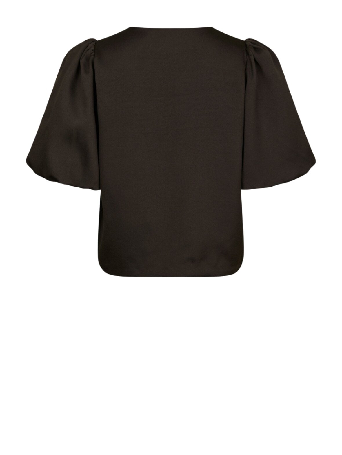 ❤︎ Smuk bluse fra Neo Noir med korte pufærmer. Aisa Dull Satin blusen er designet i smukt skinnende kvalitet. Blusen har en rund hals og dekorative sølvknapper foran.