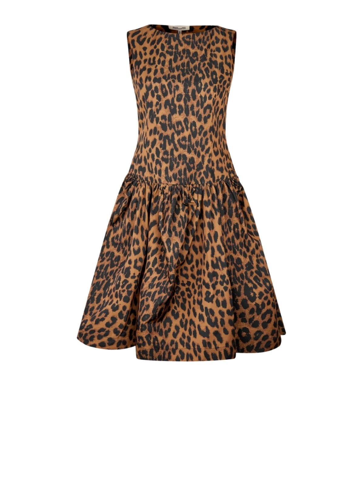 ❤︎ Skøn kjole fra Baum Und Pferdgarten i semi skinnende leopard print. Aneva kjolen er uden ærmer, har en flot båd-udskæring i halsen og et figursyet snit i taljen. Skørtet har skøn vidde og lommer i siden. Kjolen lukkes med en skjult lynlås i siden.
