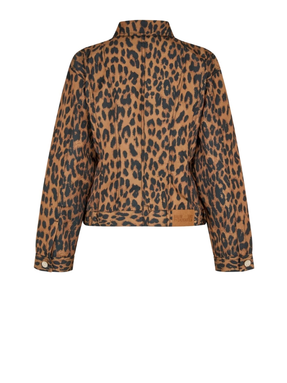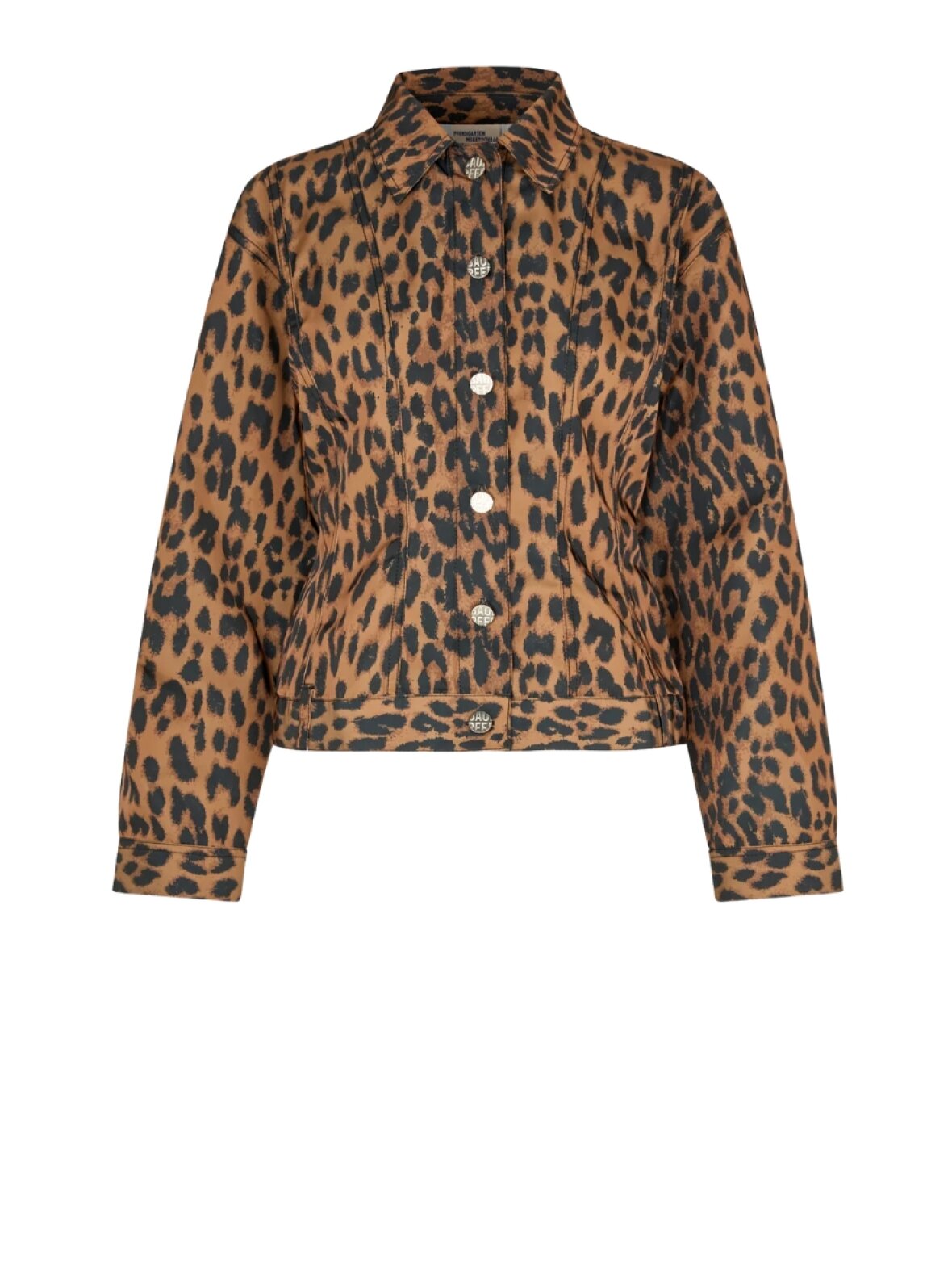 ❤︎ Skøn let jakke fra Baum Und Pferdgarten i semi skinnende leopard print. Bene jakken har lange ærmer med manchetter, en klassisk krave og et figursyet snit. Foran lukkes den med de velkendte knapper, med Baum Und Pferdgartens logo.