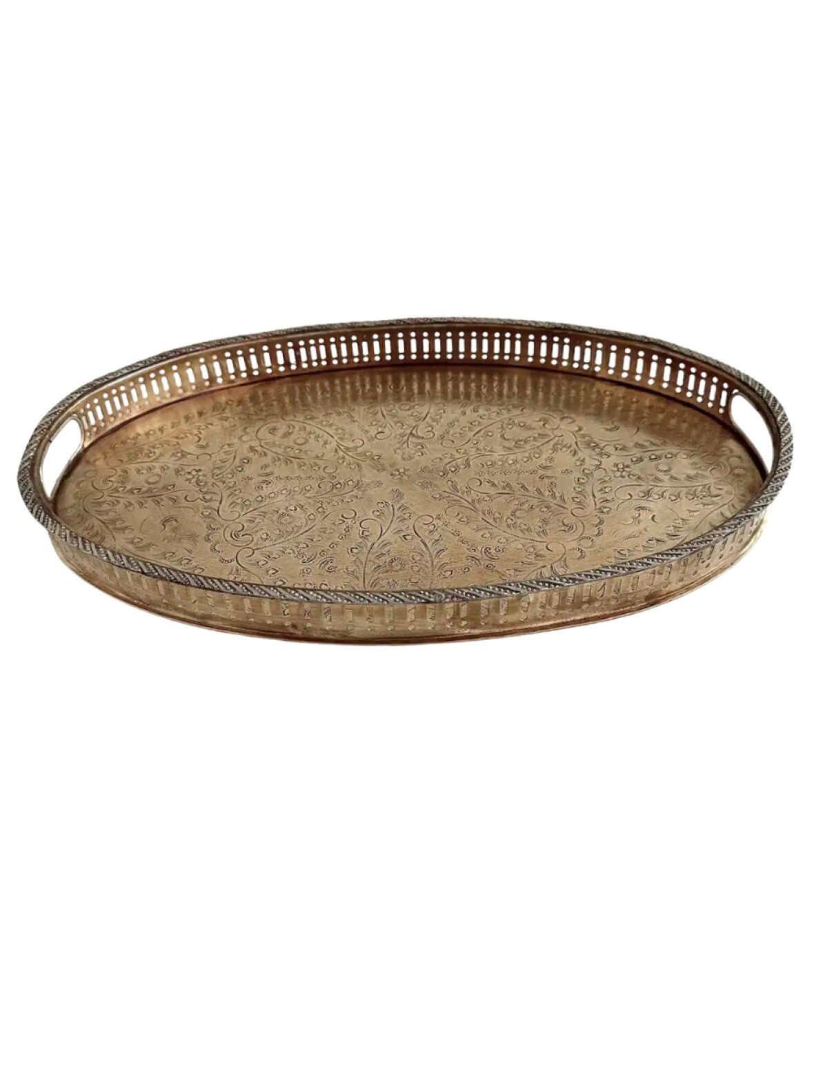 Dybt inde i Medinaen i Marrakesh er denne smukke, marokkanske vintagebakke fundet. Mere end 60 år gammel og fuld af historie og håndværkstraditioner. Denne bakke er et ægte UNIKA-fund: oval i formen, med sirligt udskårne håndtag.
