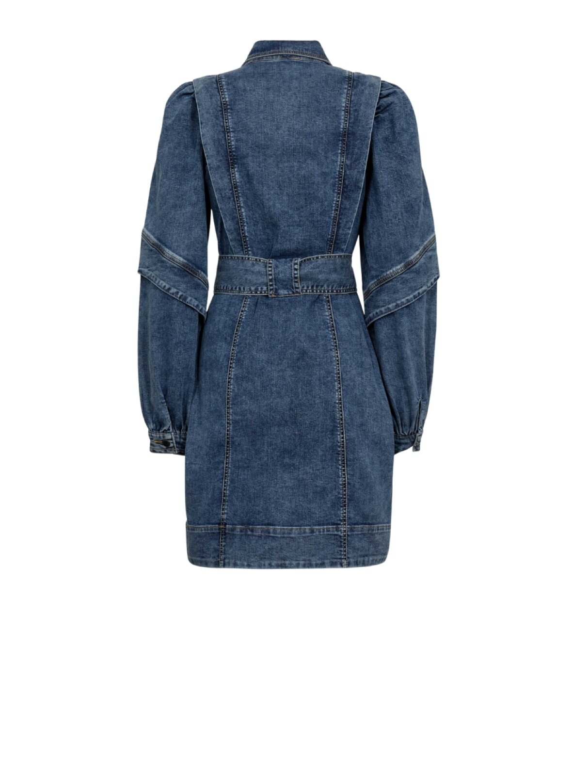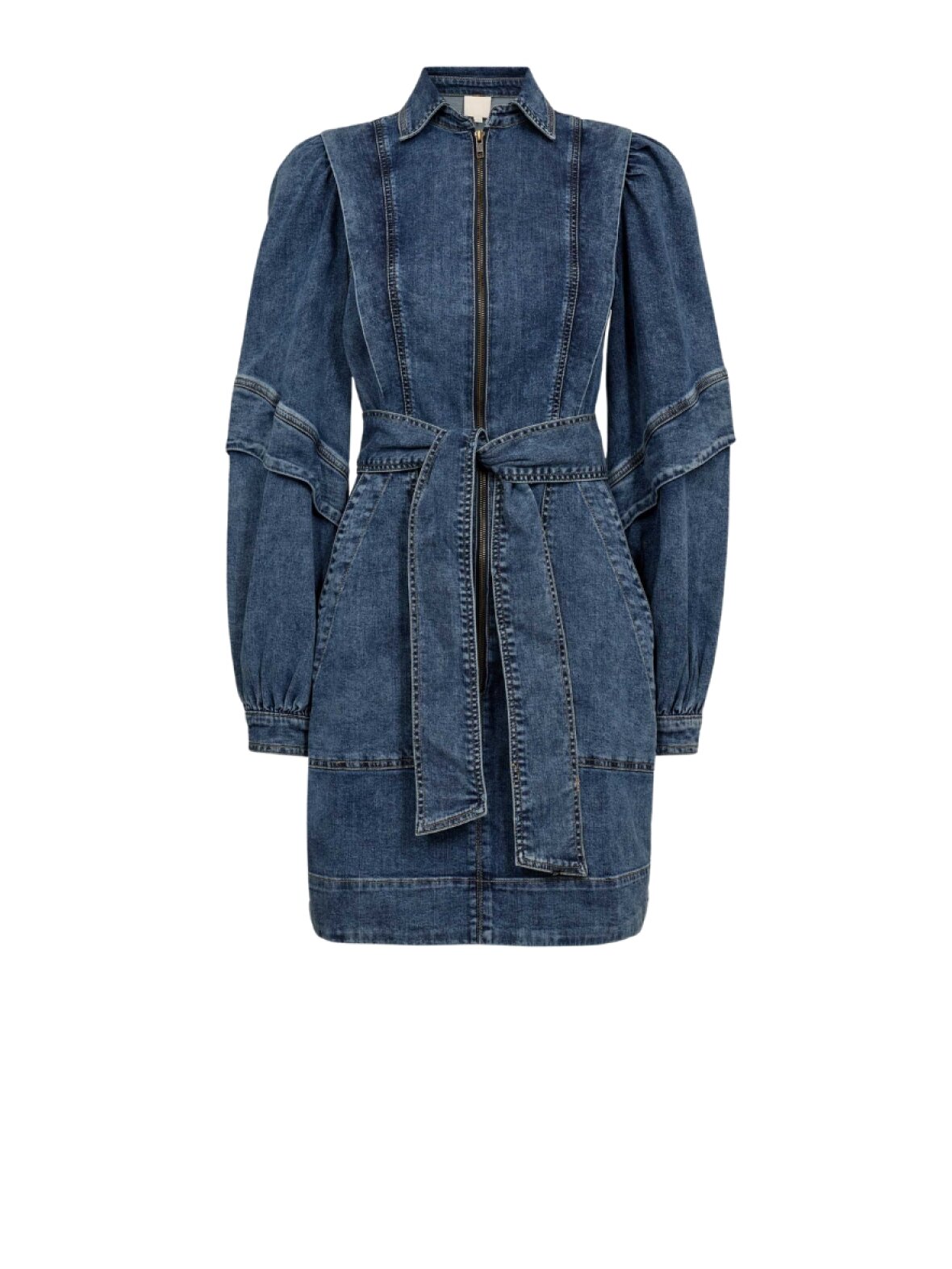 ❤︎ Smuk denim kjole fra Gossia med feminine detaljer. MyliaGO kjolen har lange voluminøse ærmer med manchetter og en tætsiddende pasform i strækbart materiale. Foran har den en klassisk krave, lynlås og rummelige lommer. Det brede bindebånd i taljen, skaber smuk figur.