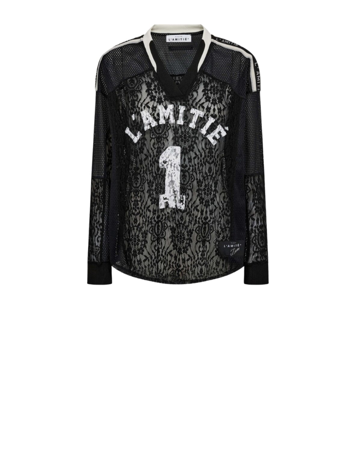 ❤︎ Super cool fodbold inspireret bluse fra Haute L'amitiè med lange ærmer. Den fine transparente blonde tilføjer en feminin elegance til det rummelige oversize fit, mens de hvid stribede rib kantbånd bevarer et sporty look.