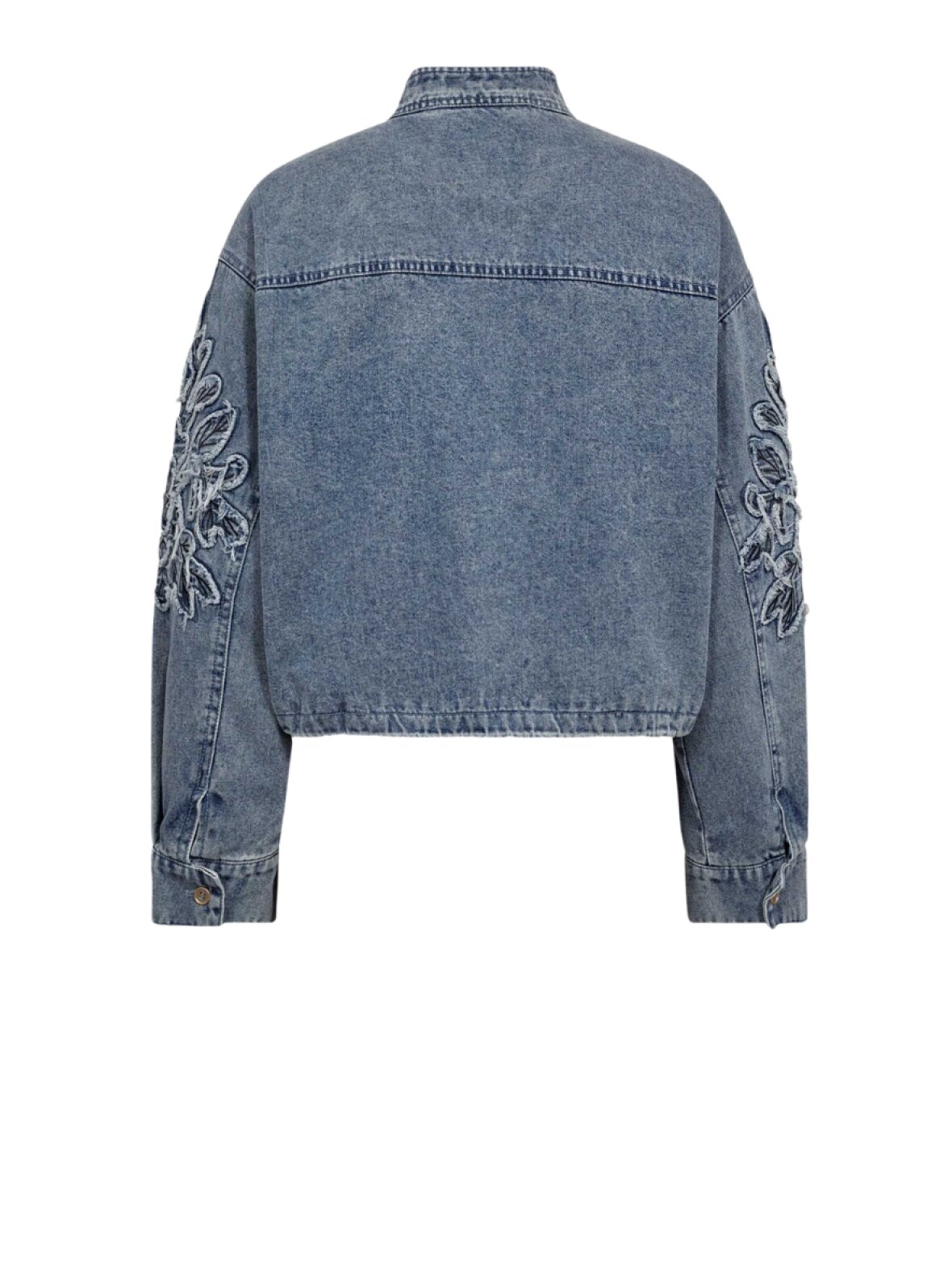 ❤︎ Skøn denim jakke fra Gossia i en flot vask. SallieGO jakken er en kort jakke med et rummeligt fit og lange ærmer, med manchetter og detaljeret broderi. Den har en rund hals, som lukkes med gylden knap og nederst kan den spændes ind i taljen med elastik.
