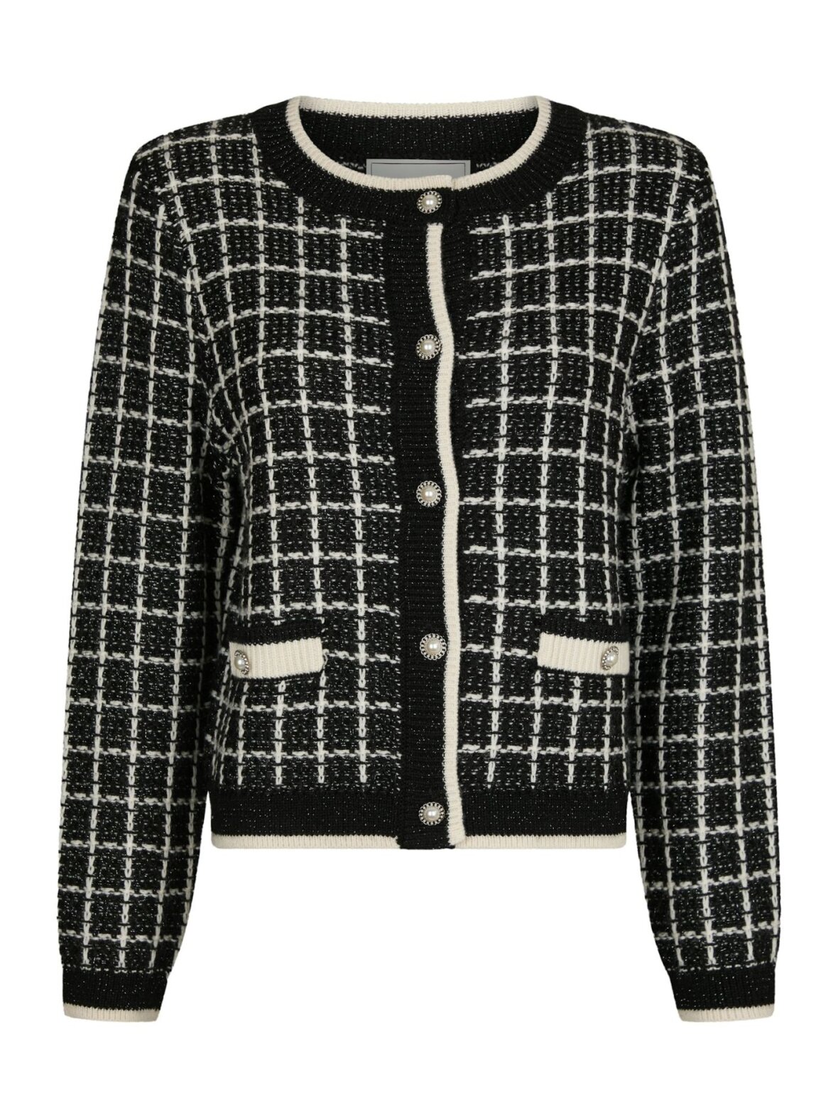 ❤︎ Flot strikket cardigan med rund hals, perlemorsknapper og fin sølvtråds detajle.