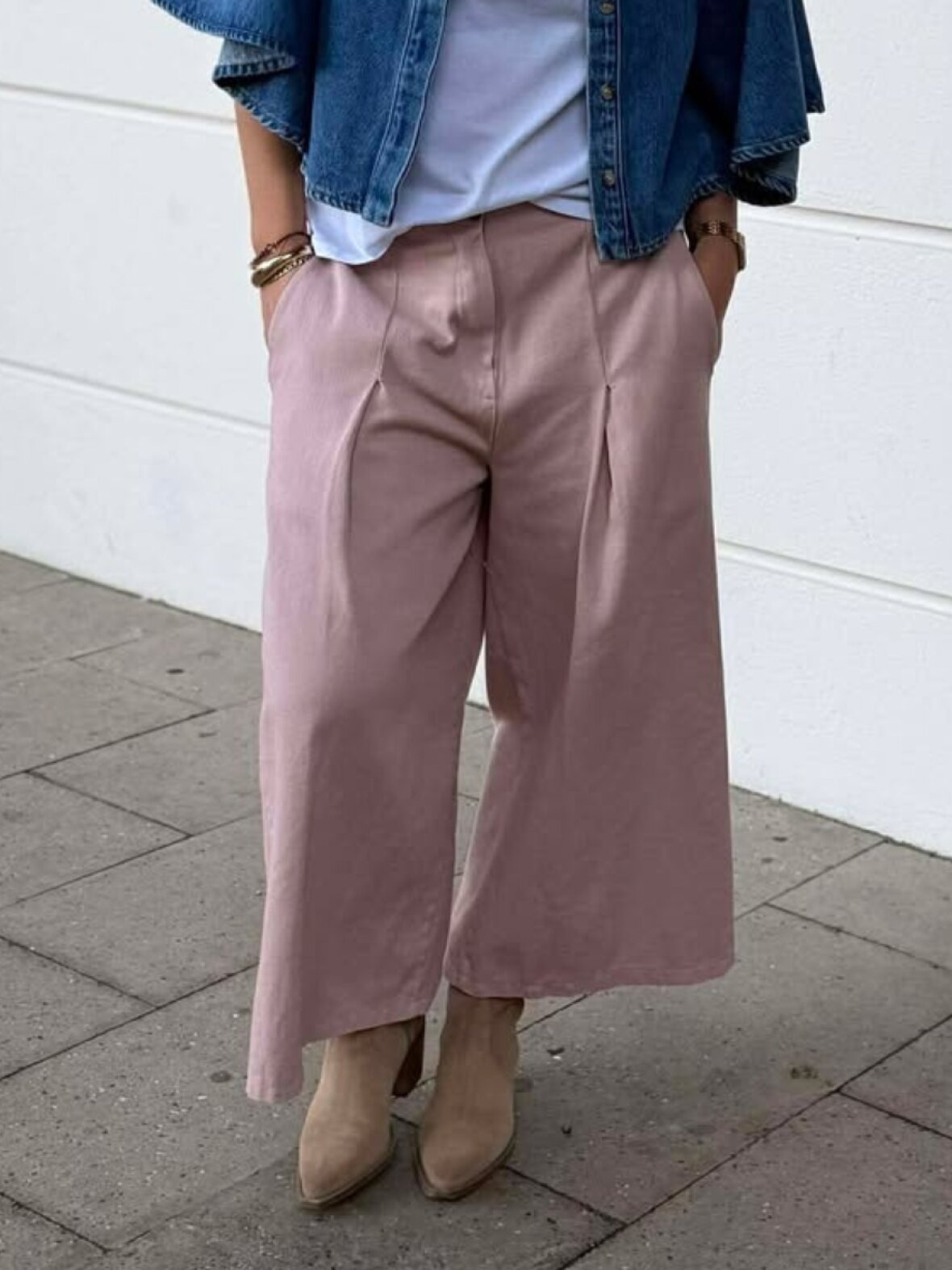❤︎ Skøn buks fra Marta. Bukserne har brede ben og er ankel længde. Har læg foran, som giver flot flad mavestykke og vidden til ben. Knaplukning og lynlås i taljen og bagpå er der elastik. Funktionelle sidelommer.