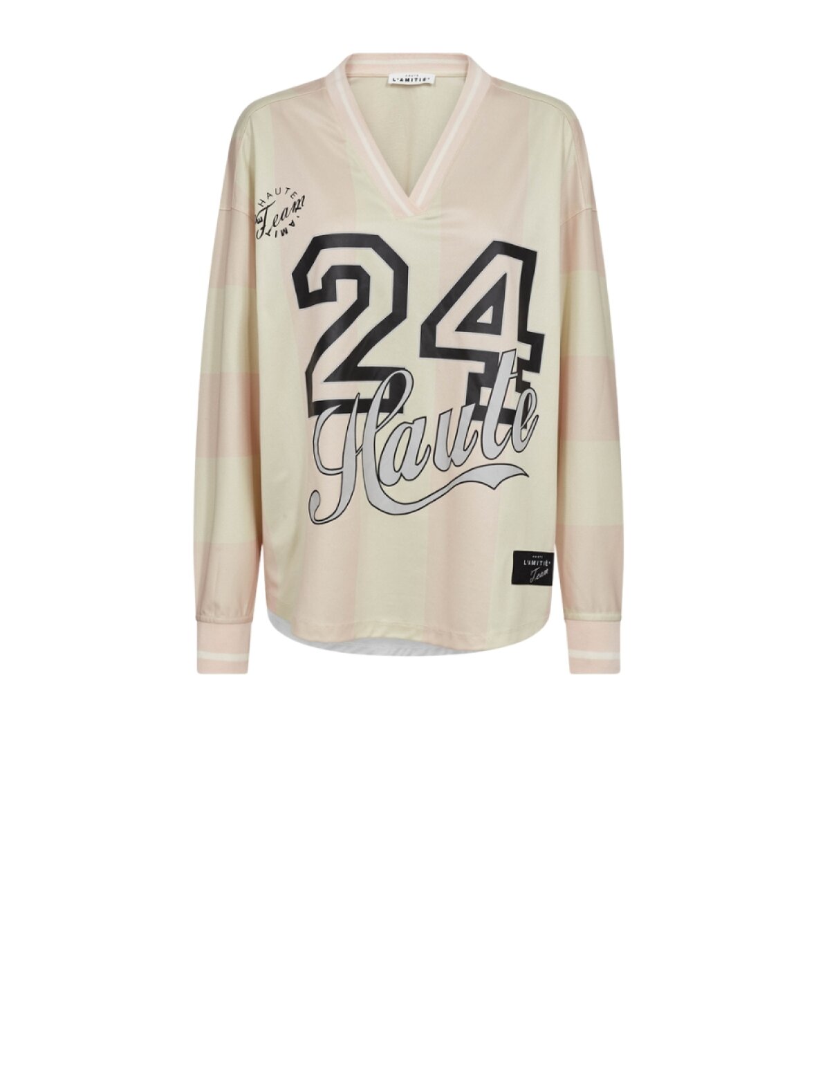 ❤︎ Super cool sporty bluse fra Haute L'amitié med brede striber. Haute 24 Stripe blusen har en v-udskæring, ribkanter og sportsinspirerede tryk. Blusen er i tyndt materiale og har en cool oversize pasform.