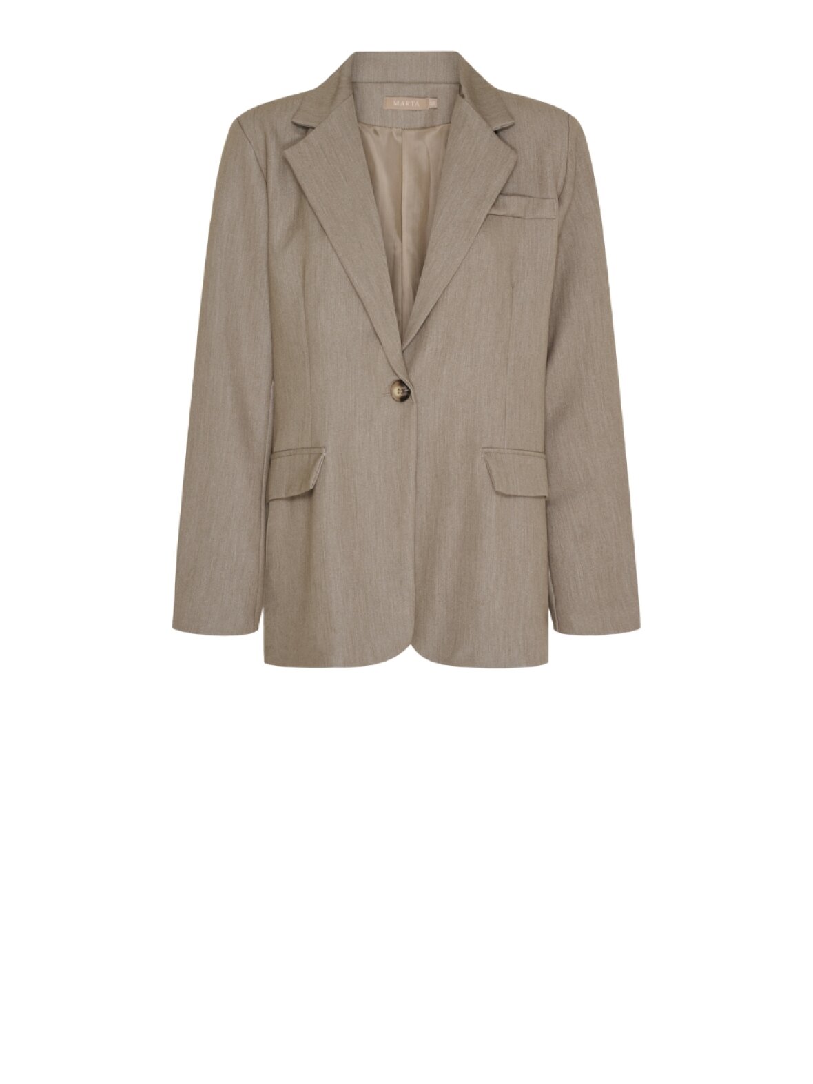 ❤︎ Smuk blazer fra Marta i blødt meleret materiale. MdcDamiana blazeren har et klassisk revers, skulderpuder og pyntelommer foran. Blazeren har et løst fit og lukkes foran med knap.