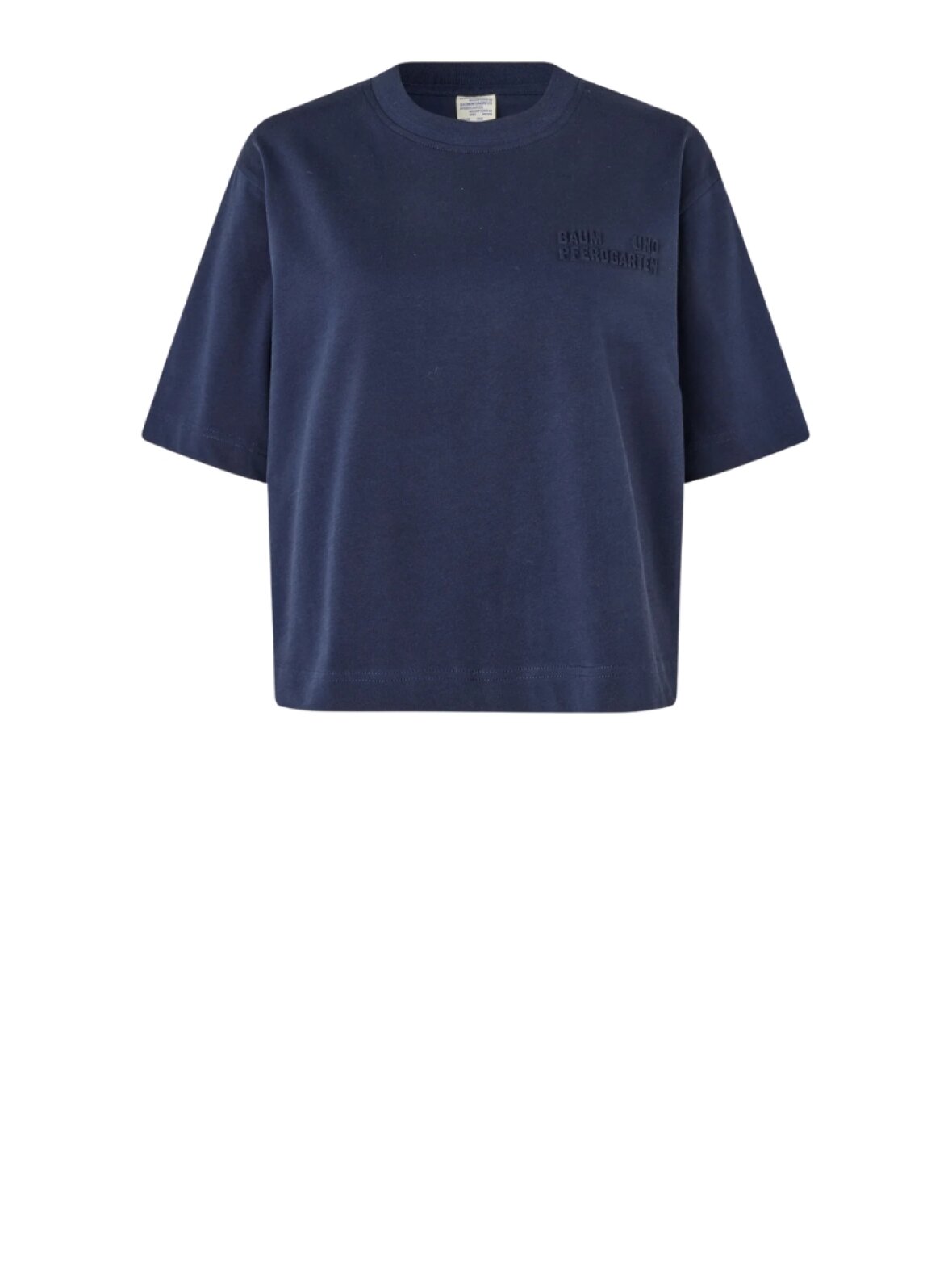 ❤︎ Cool t-shirt fra Baum Und Pferdgarten med lækkert box fit. Jiana t-shirten er en lidt kortere t-shirt med bred pasform, korte ærmer og rund hals. Foran på brystet er et tone i tone logo.