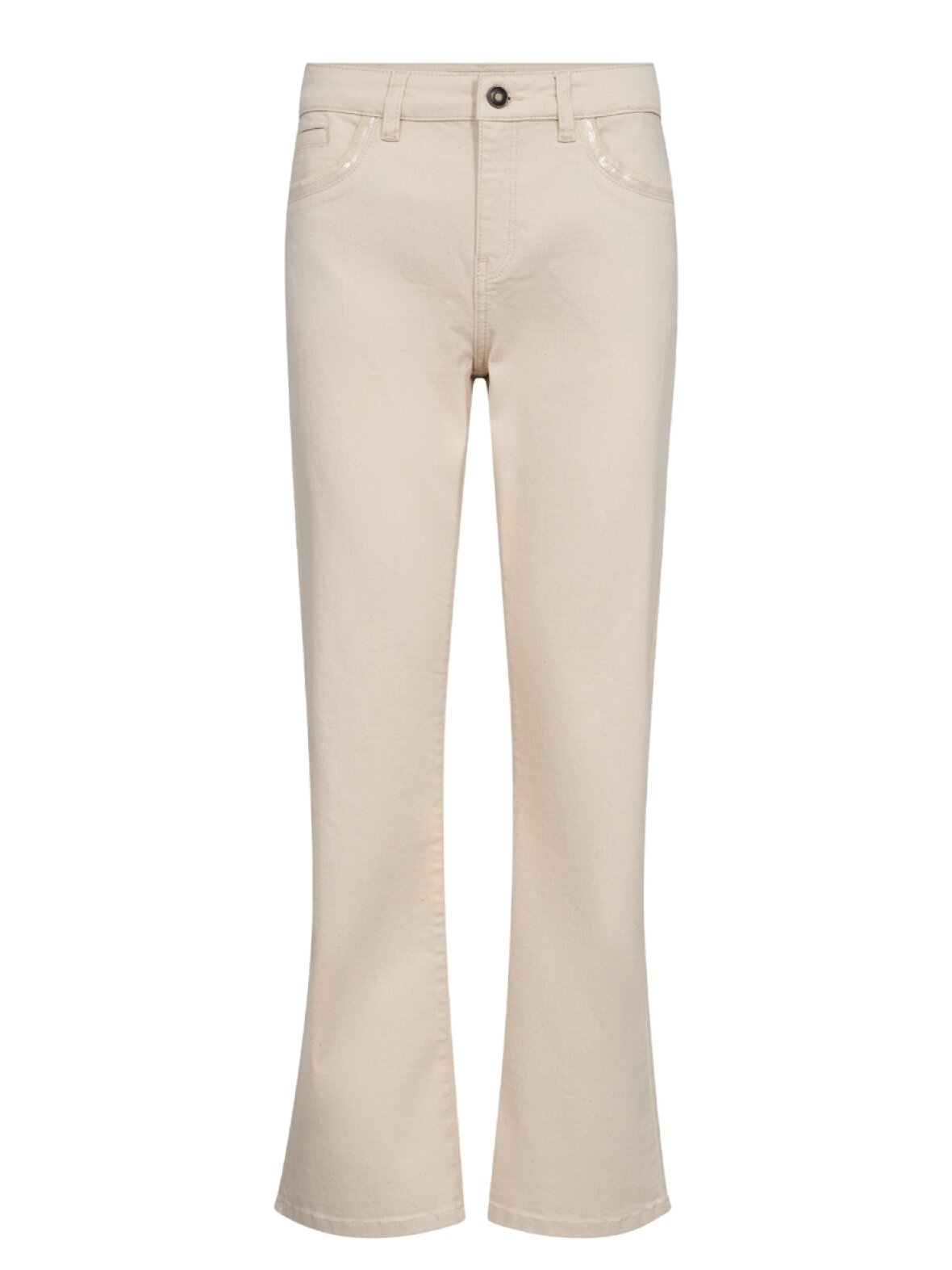 ❤︎ Skønne lyse jeans fra Mos Mosh i lækker blød strækbar kvalitet. MMCecilla Perla jeansene går til anklen og har et lille fint flared fit nederst. Ved lommerne er en fin kant af små palietter, som tilfører en feminin detalje. Bukserne lukkes med skjult lynlås og en enkelt knap.