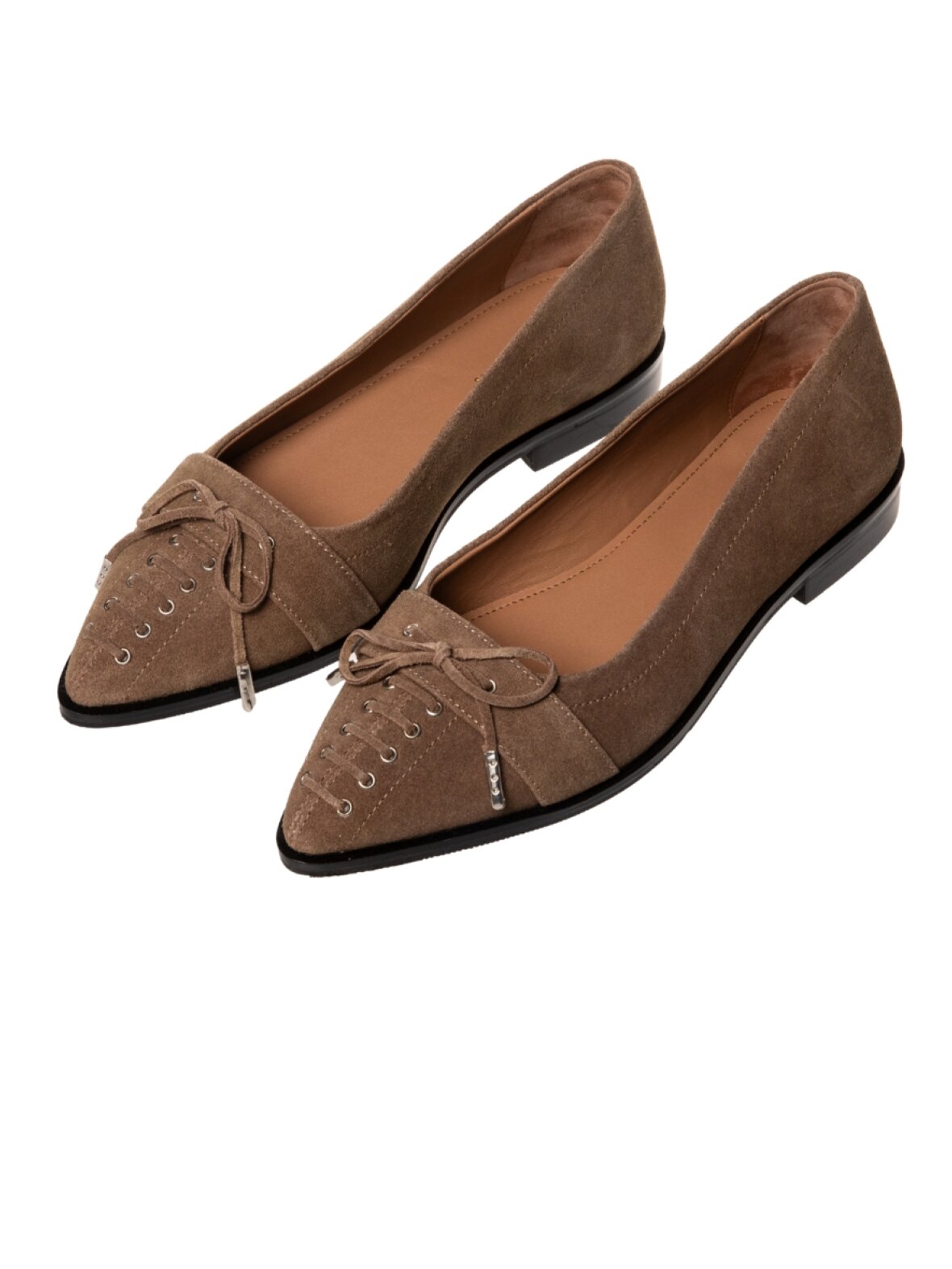 Skøn ballerina i ruskind fra Copenhagen Shoes. My Paris skoen er designet med spids snude med smuk snøre detalje på og har en super komfortabel pasform. En stilfuld sko med lille blokhæl.