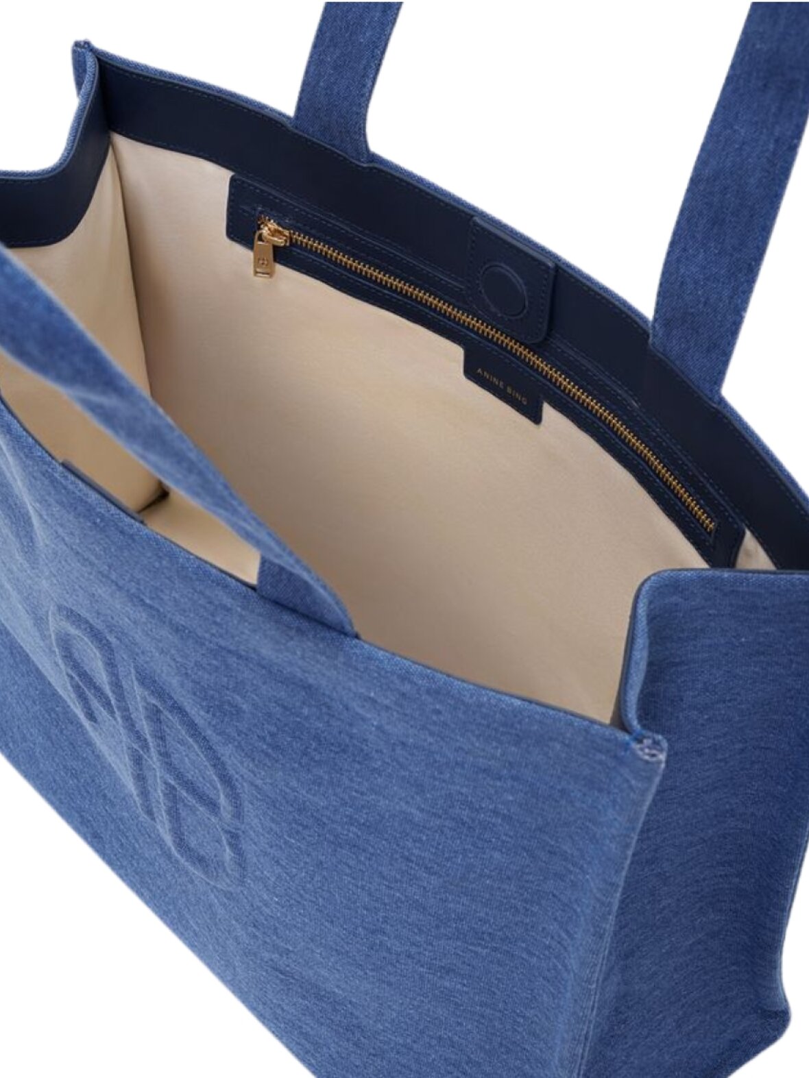 ❤︎ Cool Tote Bag fra Anine Bing i en flot denim kvalitet med to hanke. Lara tasken er designet med et stort primært rum med to mindre indvendig lommer, hvoraf den ene er med lynlåslukning. Lara tasken er præget med Anine Bing tone i tone monogram foran og lukkes med en magnetisk knap.