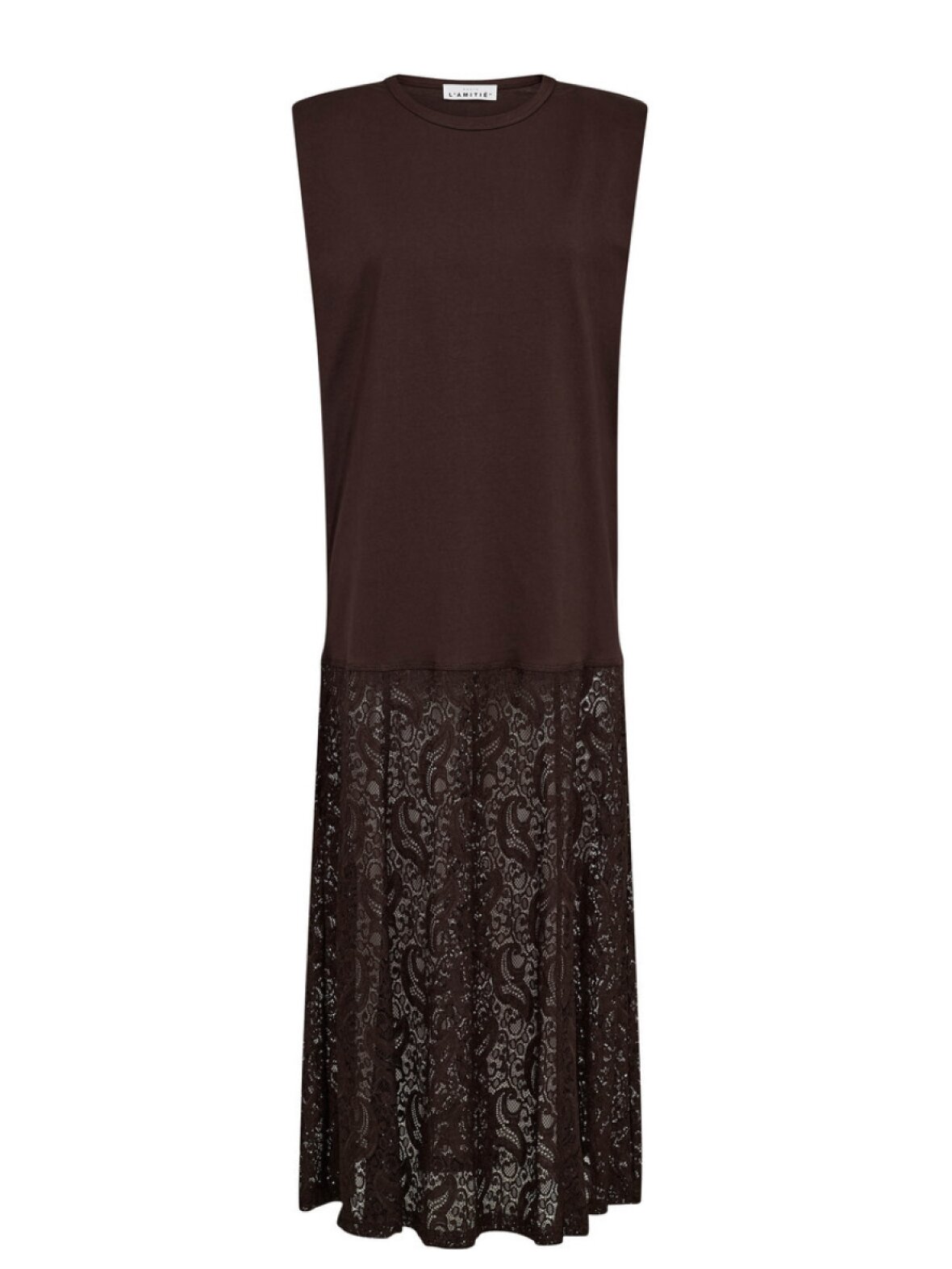 ❤︎ Skøn t-shirt kjole fra Haute L'amitié med cool box fit. Summer Lace Tee kjolen er i bomuld i det øverste stykke og bliver til transparant blondestof nederst. Den er uden ærmer, har rund hals og skulderpuder, for at fuldende box fittet.