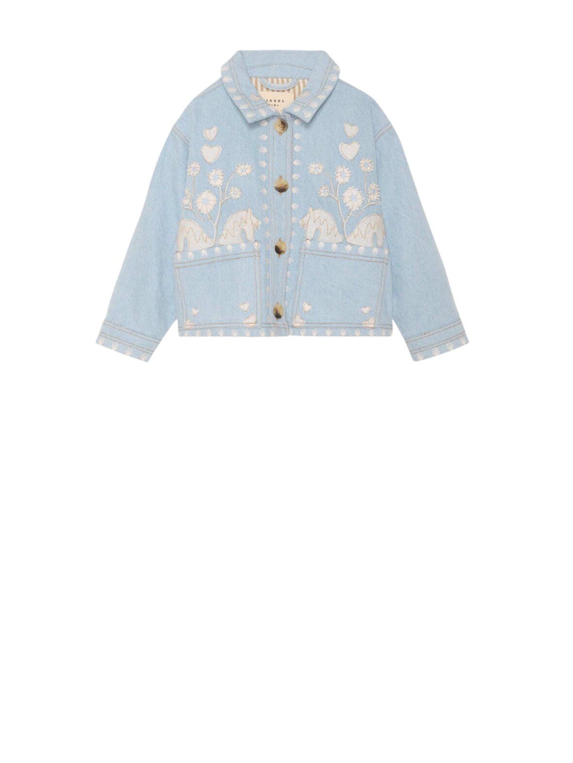 ❤︎ De fineste styles til børn er landet fra Sissel Edelbo. Christer Mini Jacket er i blød denim, har frynser bagpå og smukke broderier med fine perler. Den er designet med to frontlommer, en klassisk krave og lukkes med fine knapper.